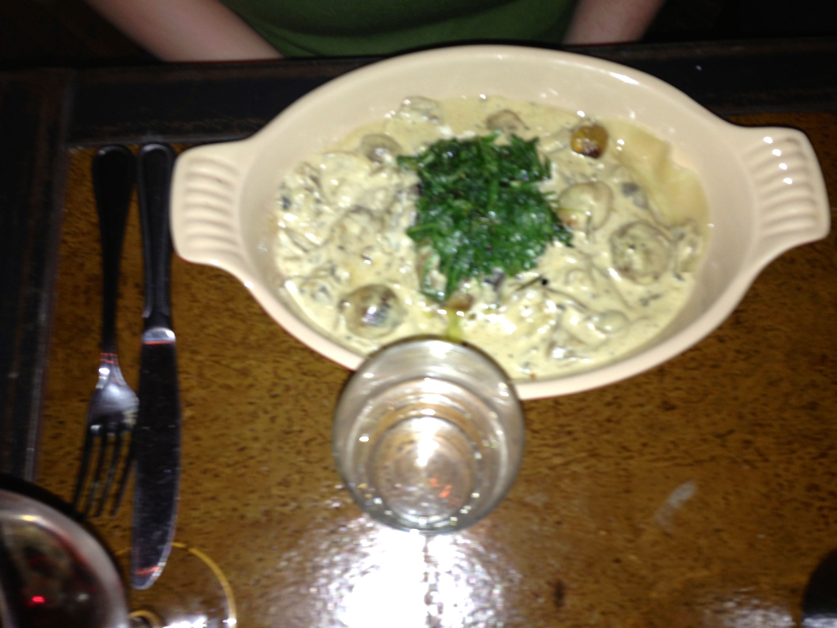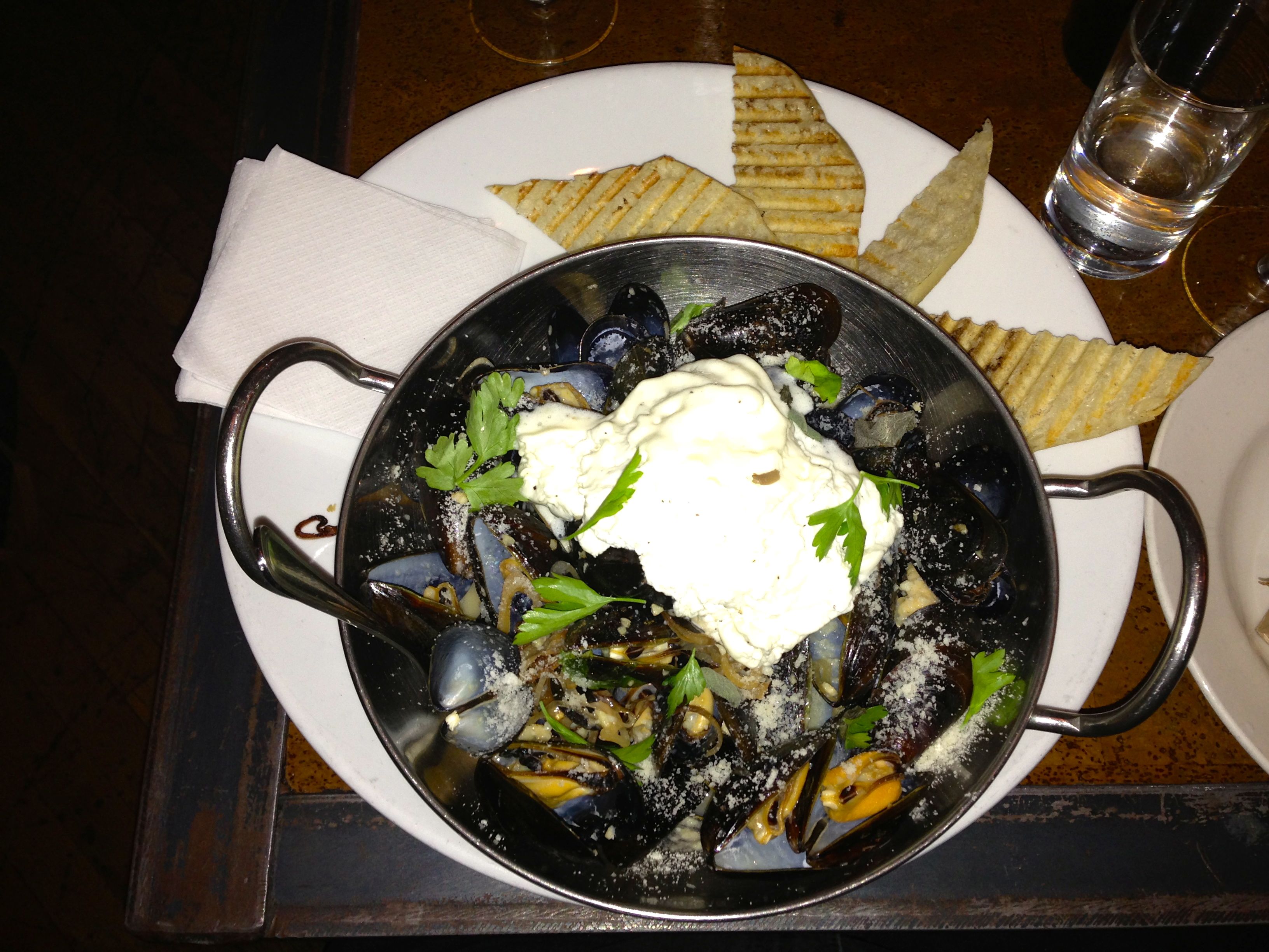 Finally, for a “light” dinner…well, sort of…reBar in Brooklyn. My fabulous cousins Jennifer and Quinn are living in DUMBO (Down Under The Manhattan Bridge Overpass). We visited them last Monday and they treated us to dinner at reBar. It’s really HIP. I felt like they might check my ID to see if I was OVERAGE. I must say it was really fun to feel “cool” again. The food, decor and service were all exceptional…It didn’t cost an arm and a leg…Instead of bread they brought seasoned popcorn AND, we could hear each other. Below you see incredible Moules and a beautiful dish of Confit Coniglio Ravioli. We had other dishes, Sweet Potato-Parsnip Cakes, Beef Carpaccio, Mac and Cheese, etc…but I was having such a good time food got devoured before photos got taken.