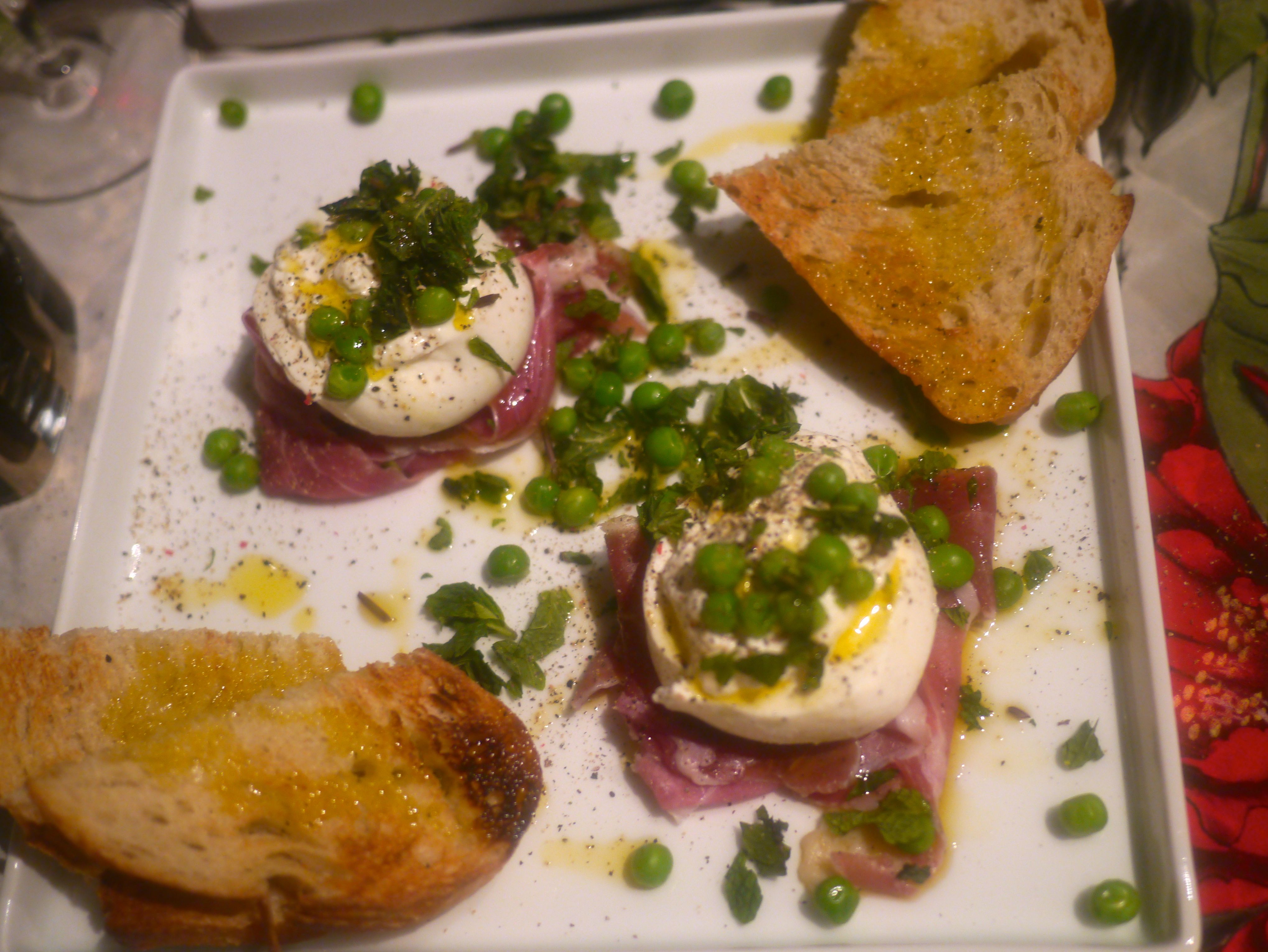 Our first plate was Prosciutto (no speck at the store), Burrata, Peas and Mint. This is very simple but a really fresh approach to the classic antipasti. I drizzled it with olive oil just pressed in November and added several turns of the pepper mill. I had crusty Tuscan bread on the side and must say it could be a meal unto itself.