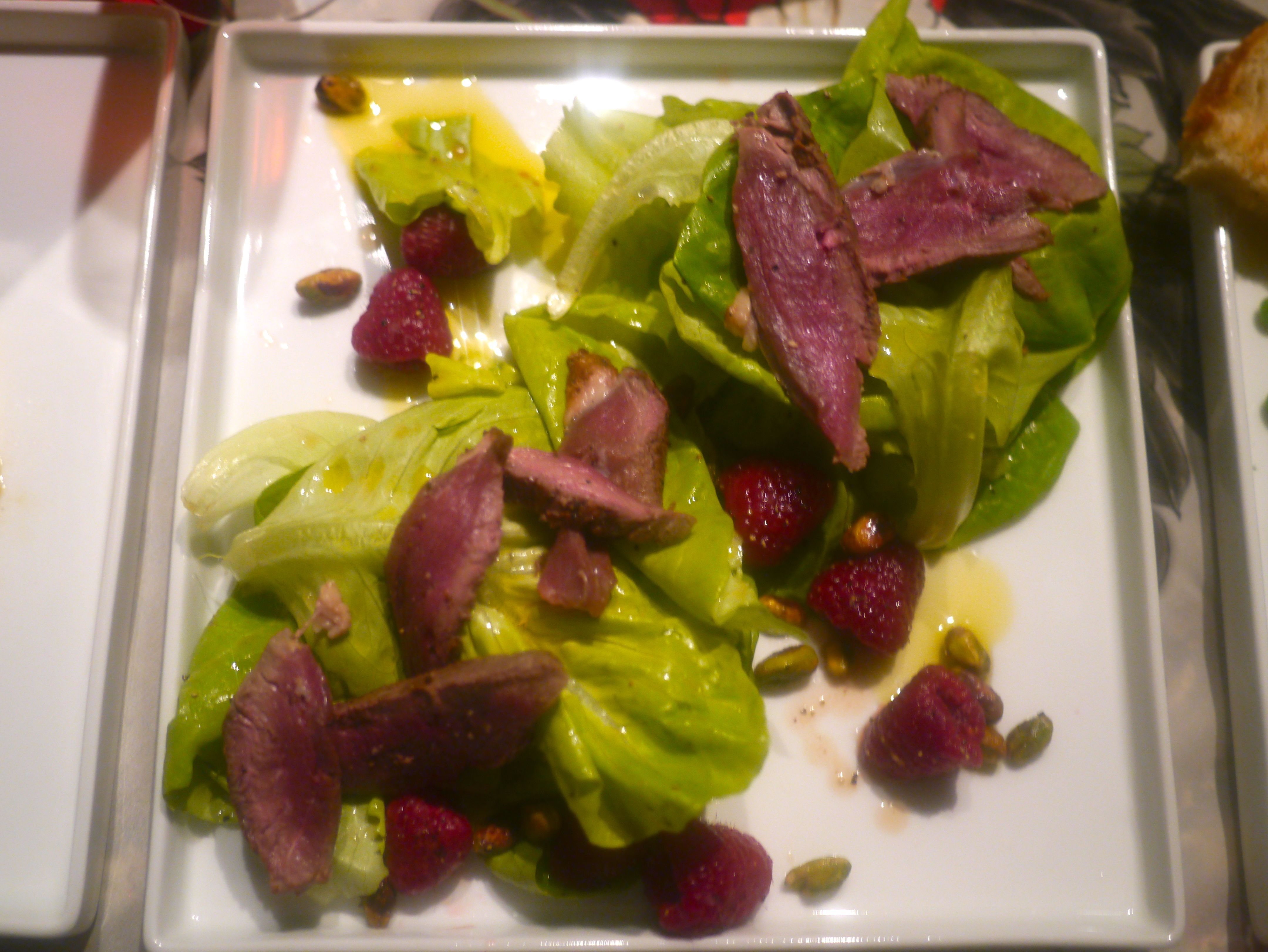 For the second plate, I used a piece of Pan-Roasted Duck left from Sunday Supper with Bibb Lettuce, Fresh Raspberries and Pistachios tossed with a dressing of White Balsamic, Honey, Orange Juice and Olive Oil.