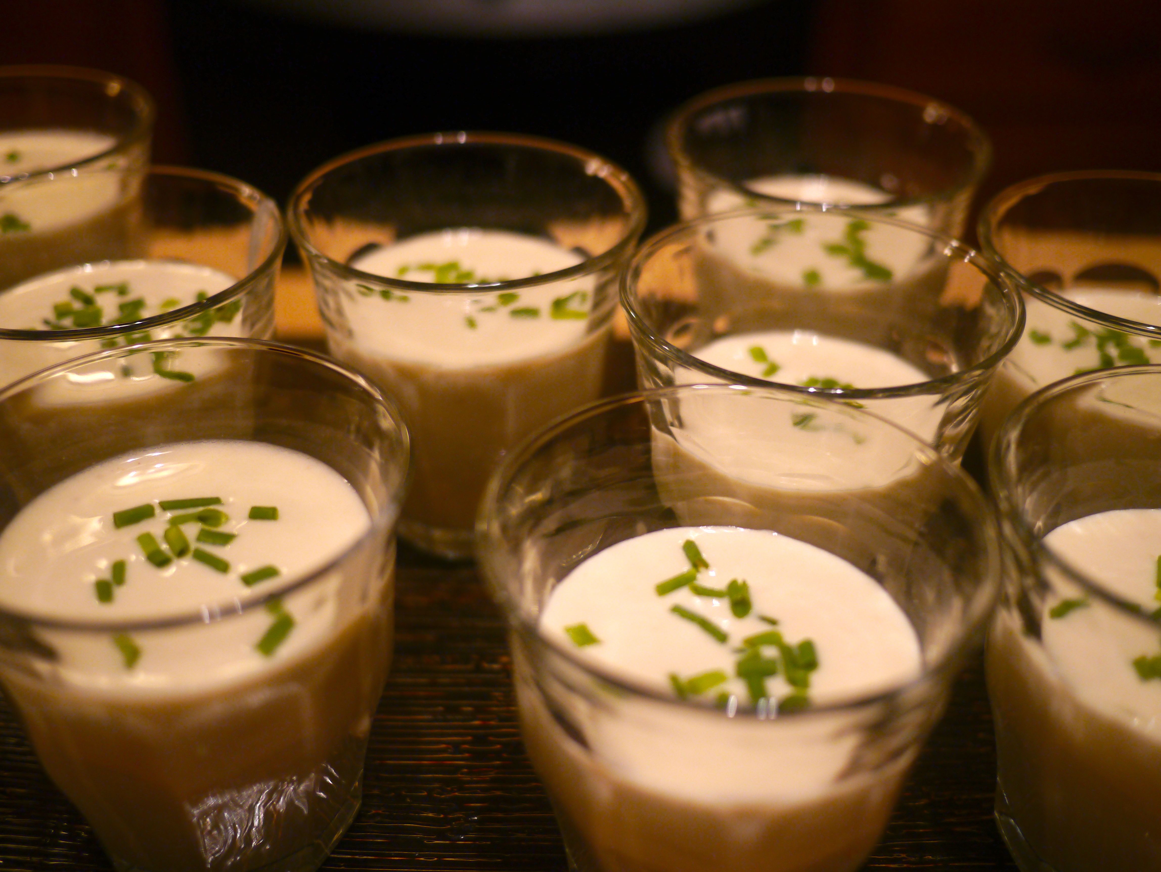 What was an ideal transition from the starter to the soup was totally un-orchestrated. However, the pacing was perfect as we were introduced to a silken Vichyssoise paired with Pascal Jolivet Sancerre. The palette relaxed as it was introduced to the perfect texture in the soup which left a vail of flavor that was gently washed about by the racy acidity of the dry and elegant Sauvignon. The soup was served in dainty French tumblers and the wine in cinch stemware. We were encouraged to migrate to the dining room and posed around the table displaying double-fisted technique in grand style.