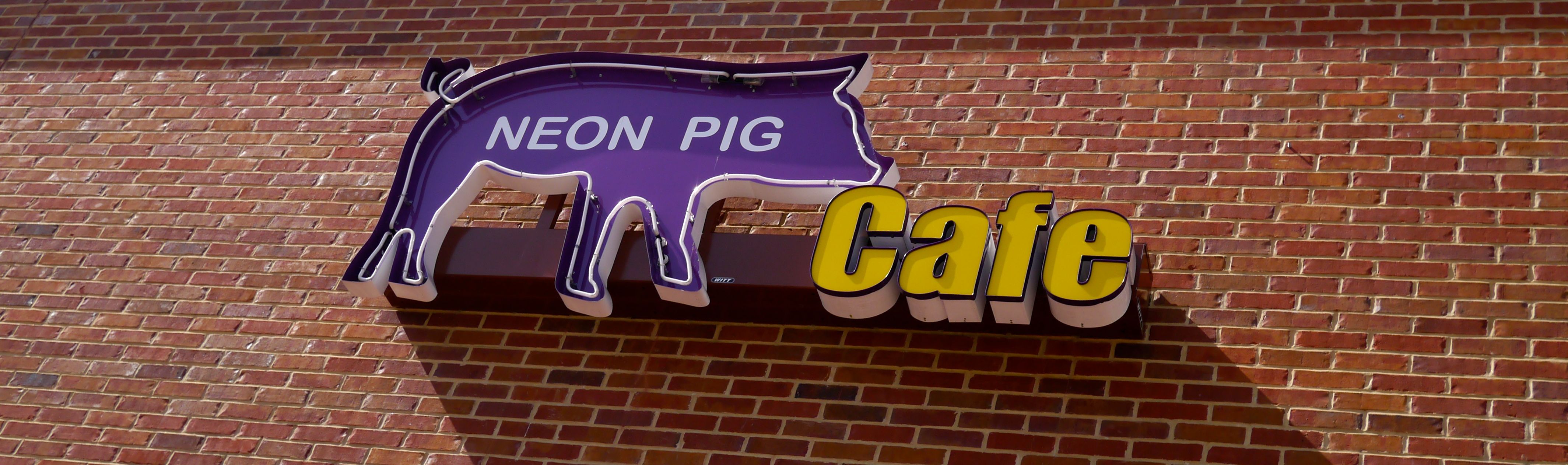 After a morning of “work” of course we had to have lunch.  My client had told me about a new chef in town and his very cool restaurant. Remember how I started the post.  When I was growing up “going out to eat” was Pizza Hut.  I loved their Italian dressing. Well, there’s still Pizza Hut in Tupelo and every other chain you can imagine.  However, there’s a new “pig” in town that rocked my world….a NEON PIG!!!