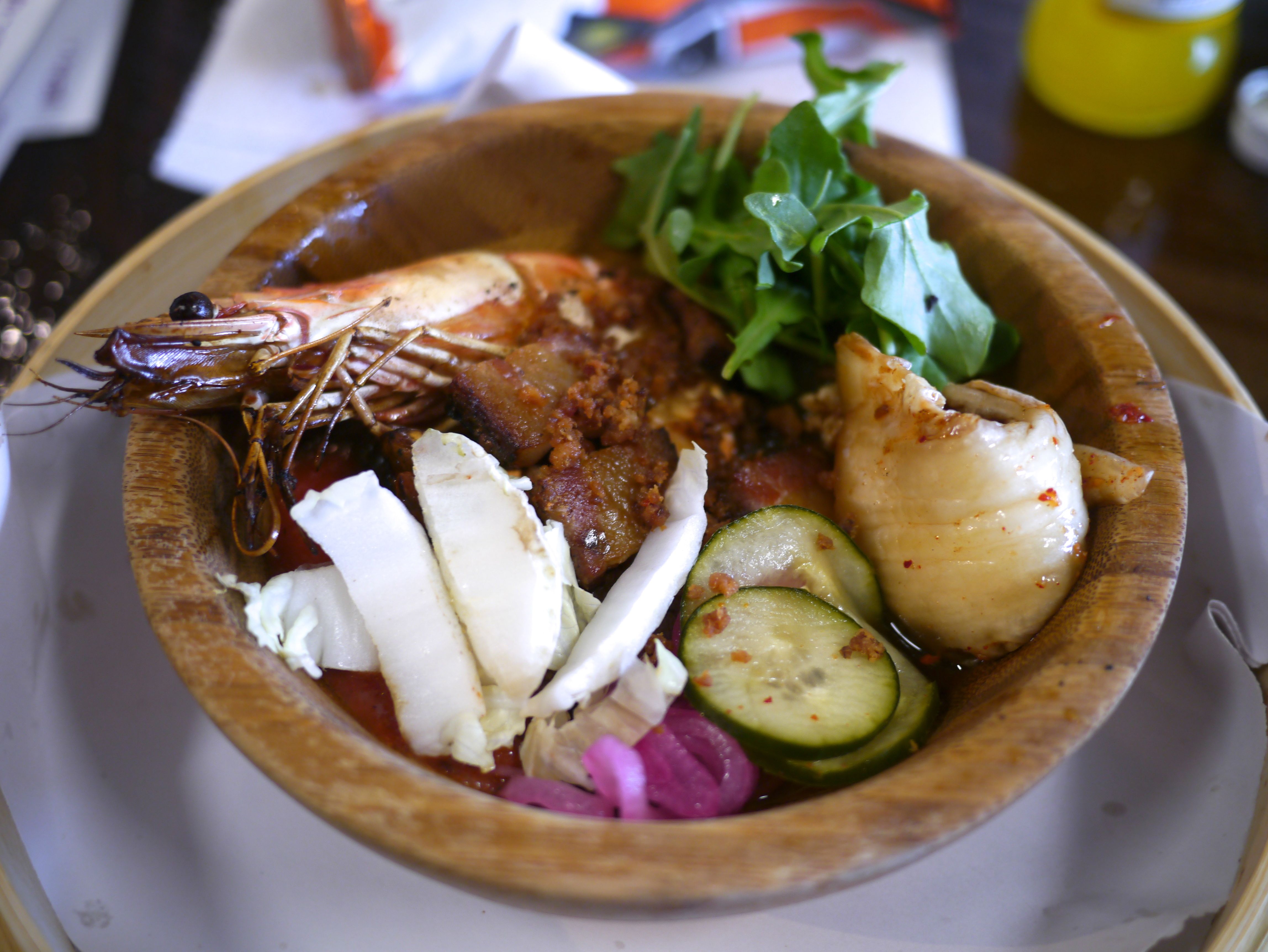 With little more than a “hello, glad to meet you”  Chef Mitch McCamey hit my love for all things Asian…AND seafood and knocked it out of the park.  I’m still reeling over the prawn.  He did a noodle bowl including glass noodles in a light broth, with grilled prawn, seared pork belly, kimchi, pickled cucumbers and onion and fresh greens.  The composition was not only a work of art but encompassed all my loves in one dish.