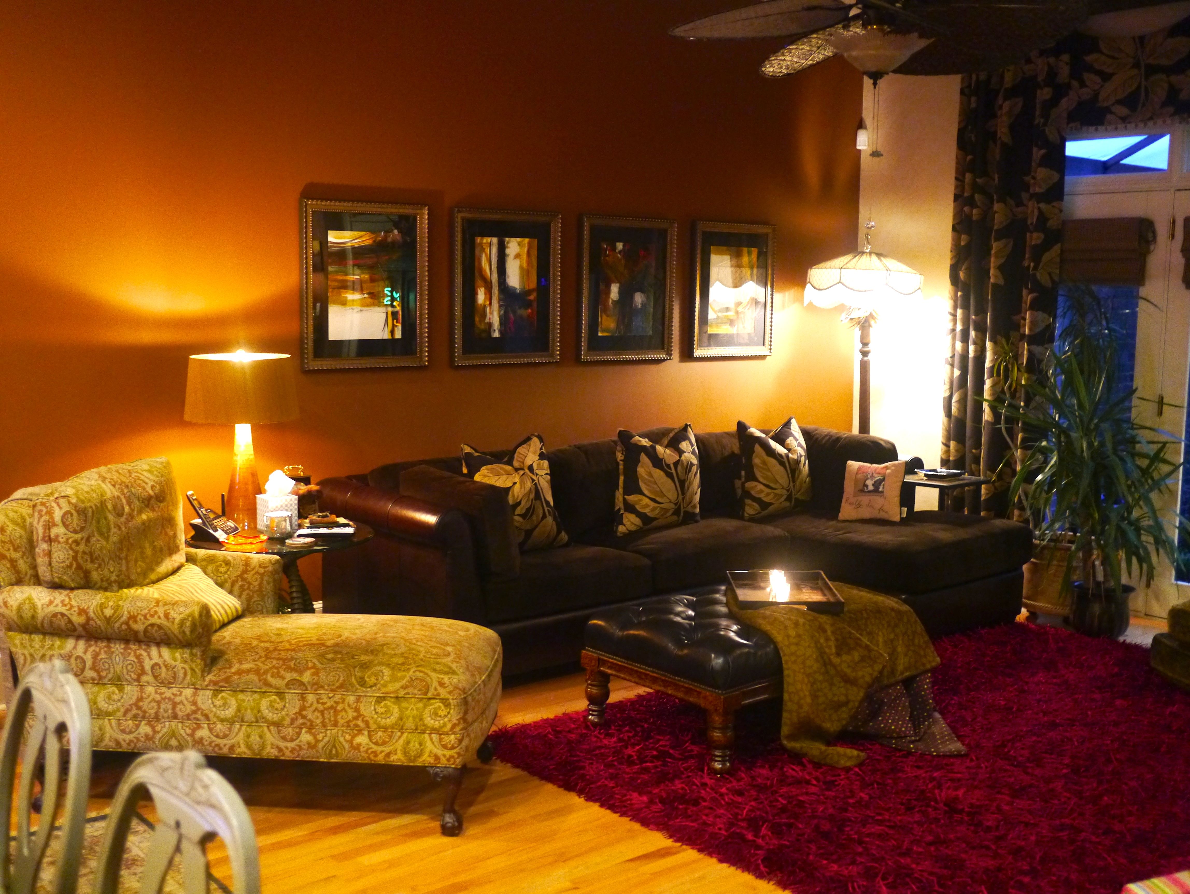 The home features an open floor plan with a demonstration kitchen, dining and living room combination. The artwork over the sofa is by Rick Anderson of Clinton, MS. I bought the piece as one work of art. Then cut it in to four equal pieces and framed them to hang as a grouping. This is the second furniture arrangement we’ve done since she moved in. Originally I hung them as a four square in the same order as the original creation.