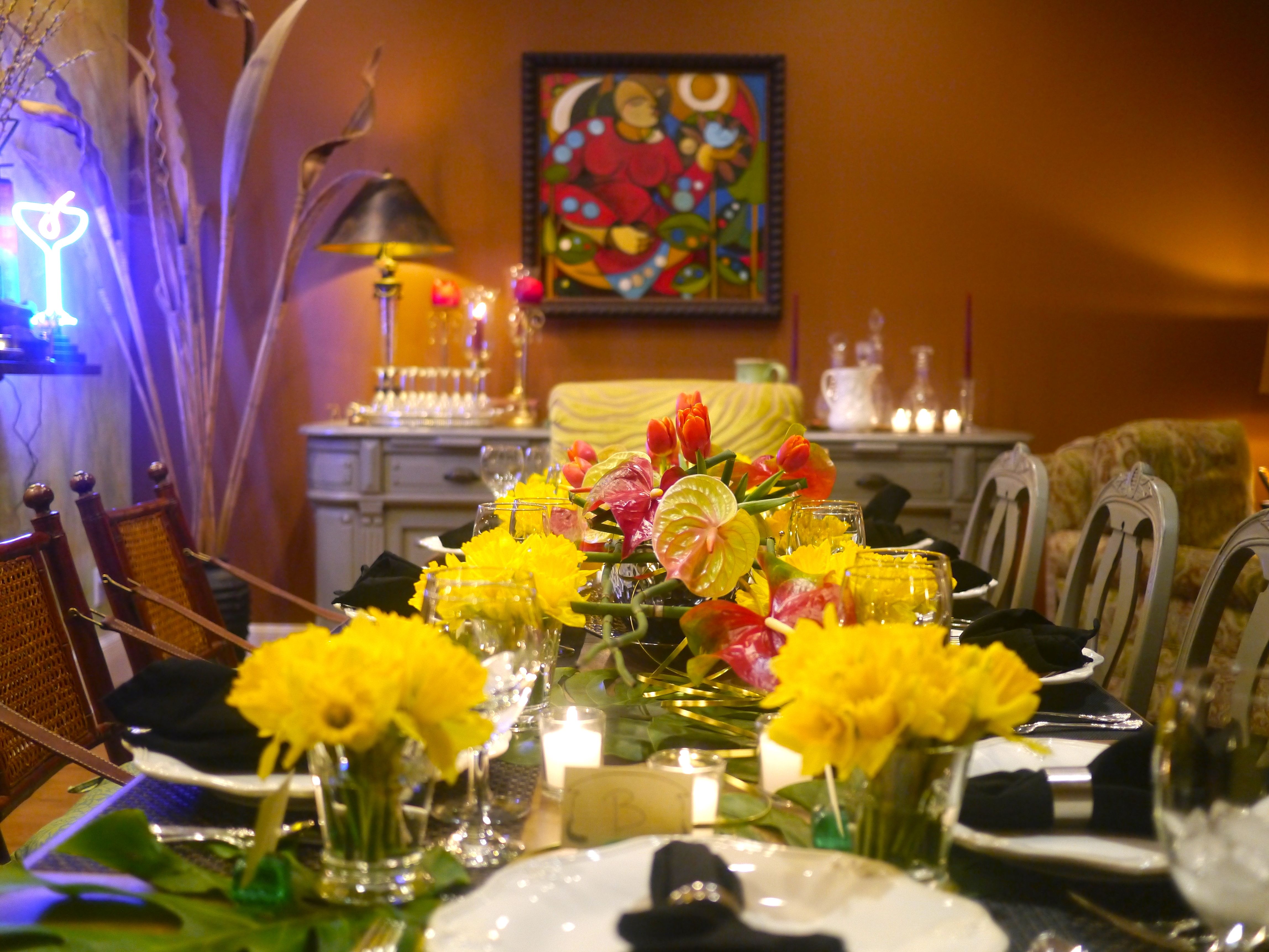 The centerpiece was composed of anthuriums and tulips in a lattice of equisetum (horsetail or snake grass). The place settings were marked with French Water Goblets full of Jonquils.