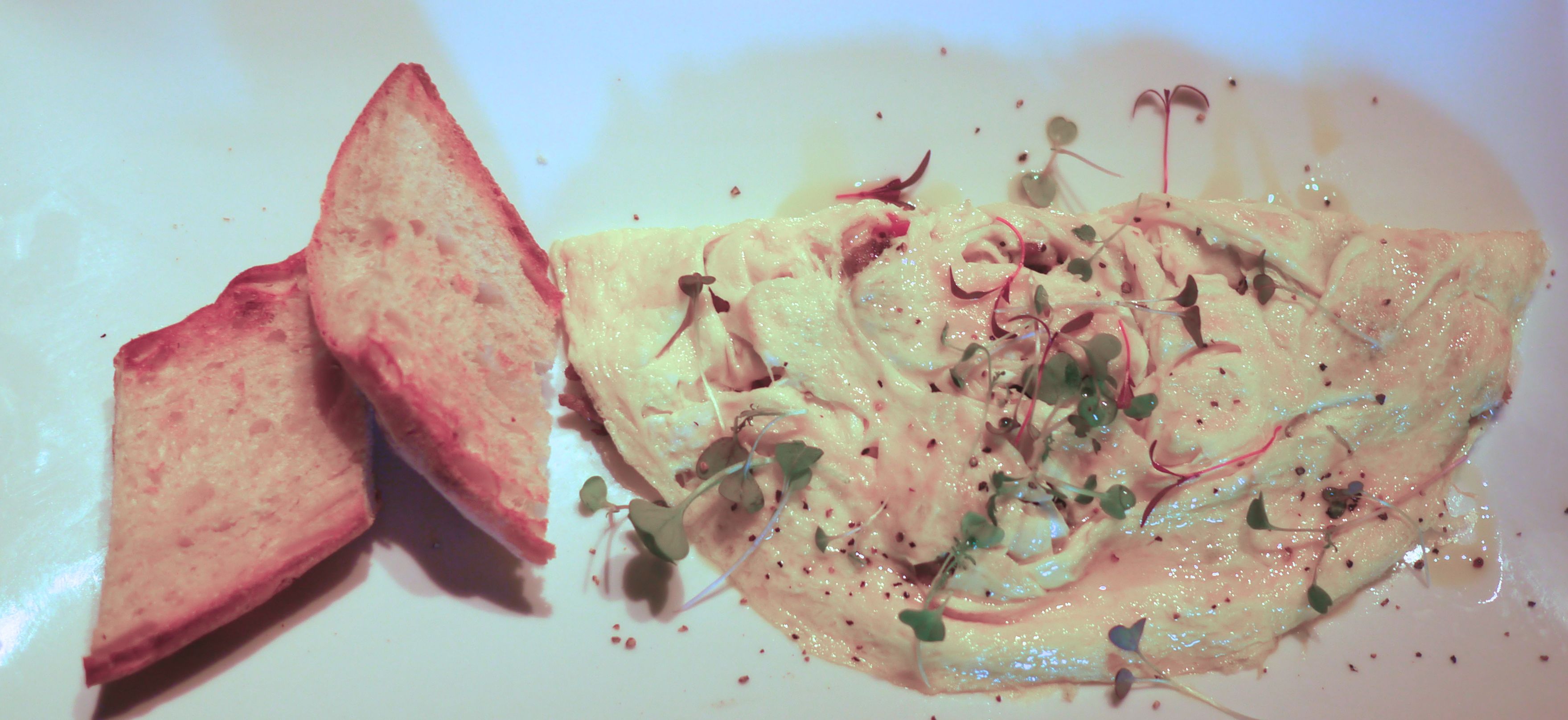 Omelette with Sausage, Lion’s Mane Mushrooms, Red Peppers and Robusto Cheese…micro greens, cracked pepper, olive oil and Toasted Baguette.