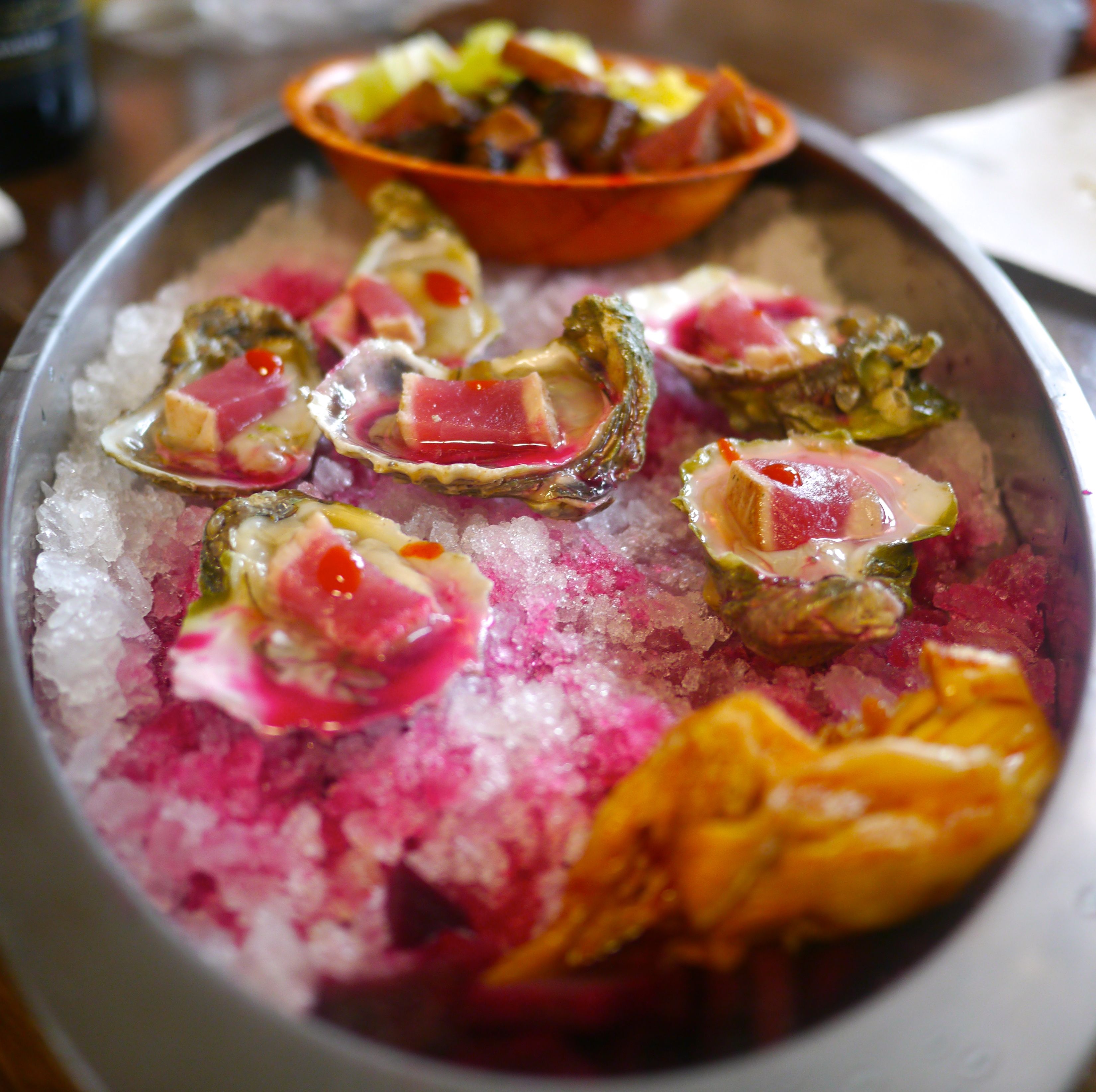 …can you just DIE!!! This is oysters that were swimming in the Gulf the day before topped with Seared Tuna and Beet Aqua Vitae accompanied by House Made Kimchi. Then in the bowl is more tuna and for “dessert” Mitch’s Pig Candy. Okay, enough!!! Mitch is working on another dining establishment in Tupelo. That town is so lucky New York hasn’t snatched him up!!!