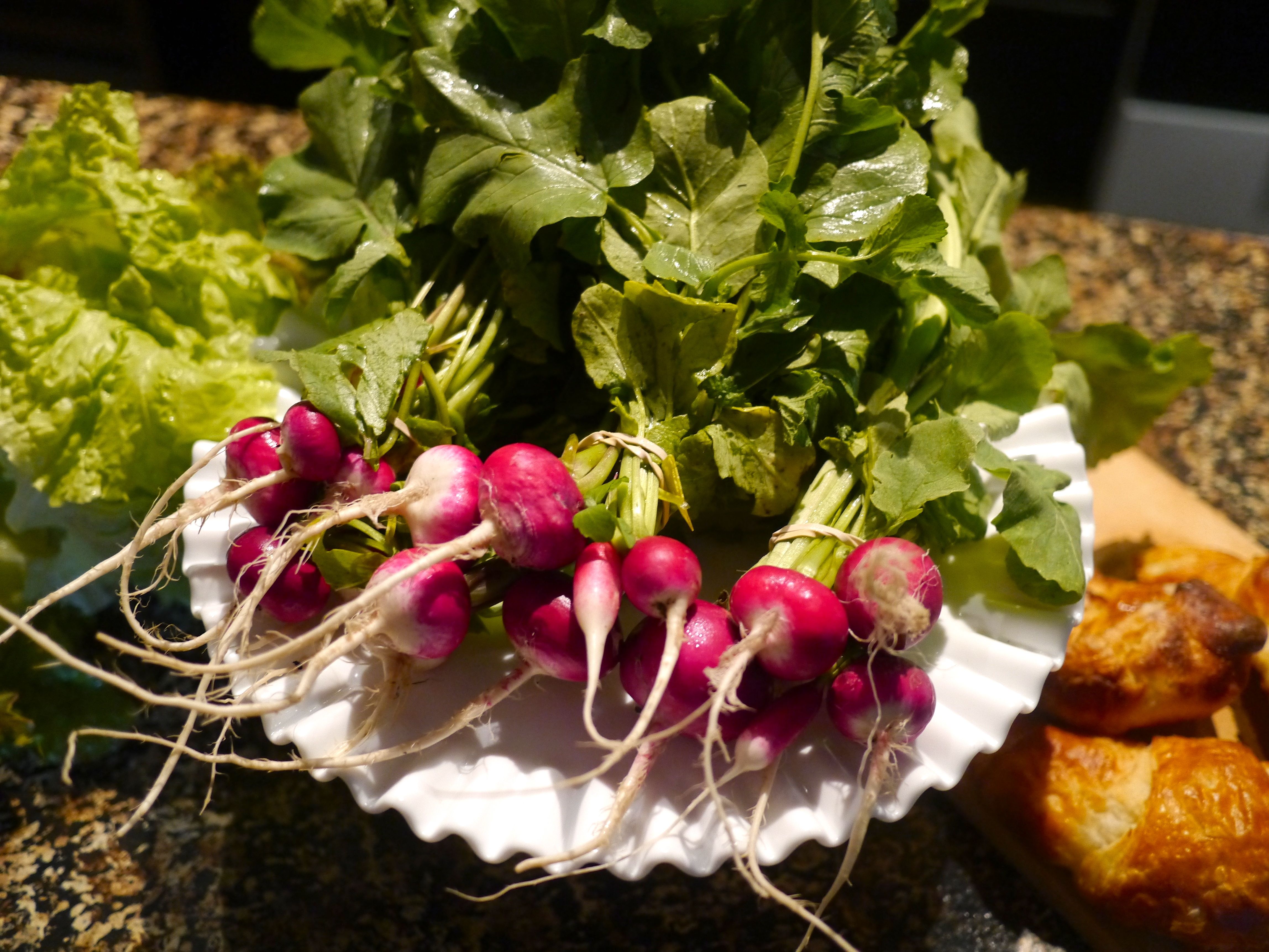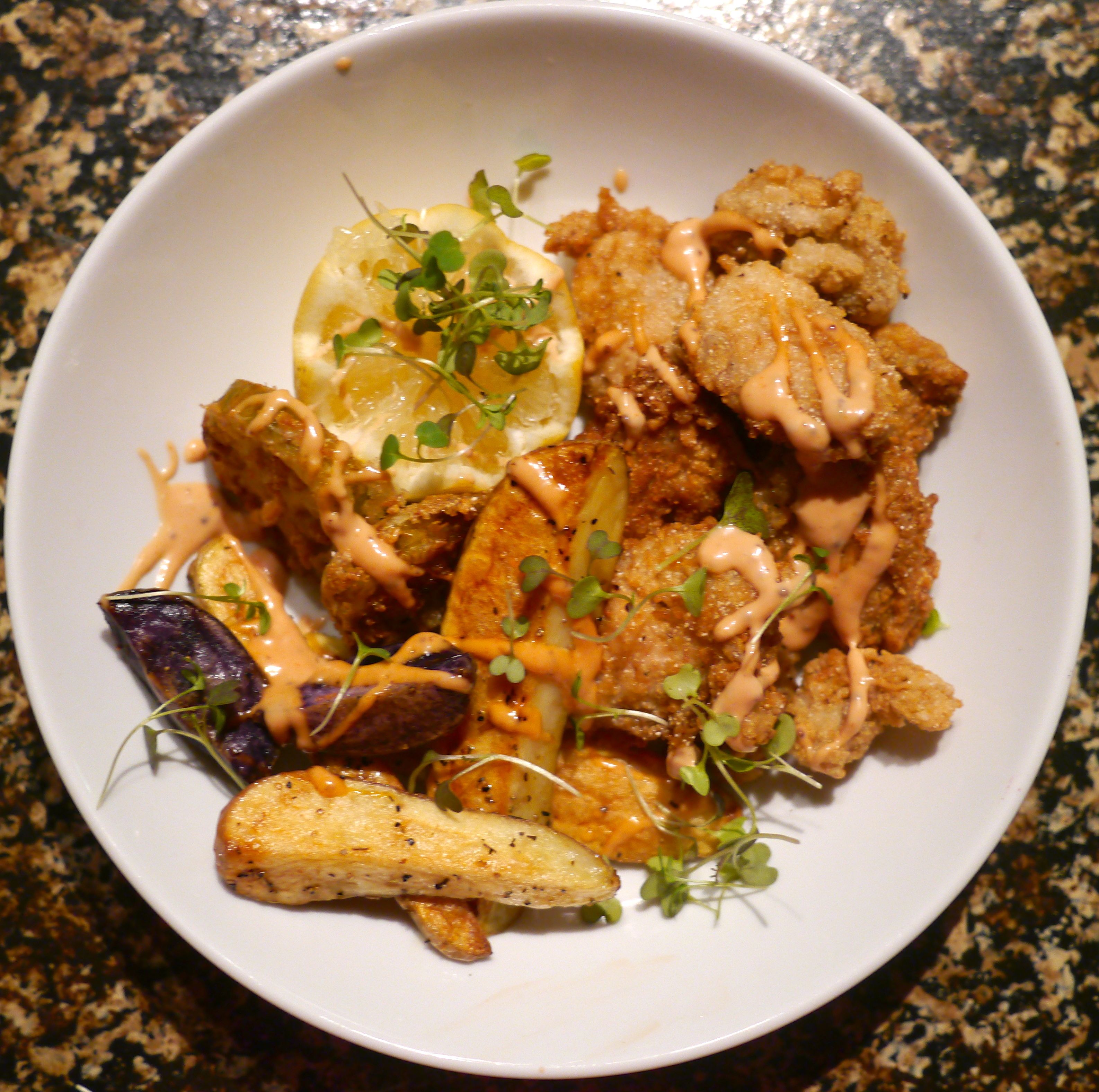 For the entrée we enjoyed Paradise Seafood Oysters. They waltzed through a bath of buttermilk and then did the shake in a mix of AP flour, cornmeal and Panko breadcrumbs with salt and pepper. At the last minute I let a couple of green heirlooms join the dance and added Roasted Fingerlings to complete the dish. Homemade Remoulade and Rocking Micro Greens visited the dish and made for a FABULOUS Saturday Supper.