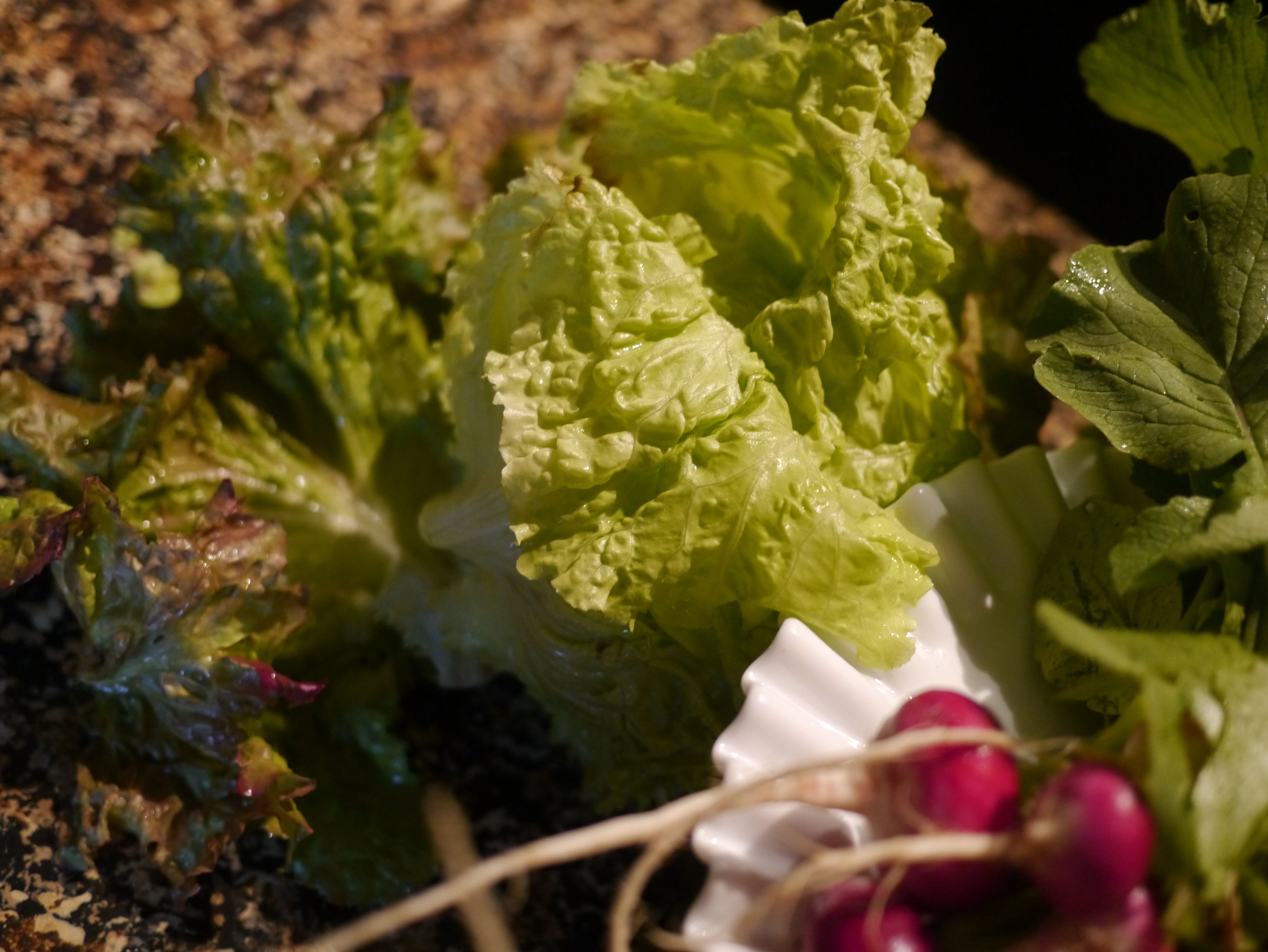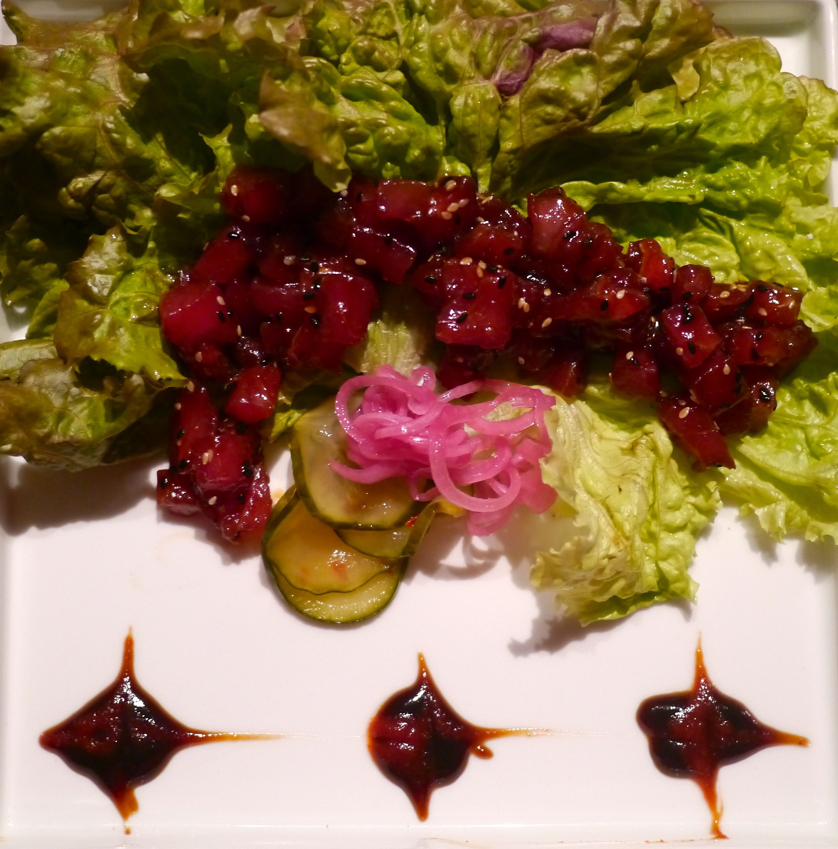 Saturday’s dinner started with Lettuce Wraps…Paradise Seafood Sashimi Tuna on True Vine Lettuce dressed in Asian Goodness with Pickles and Onions from Neon Pig.