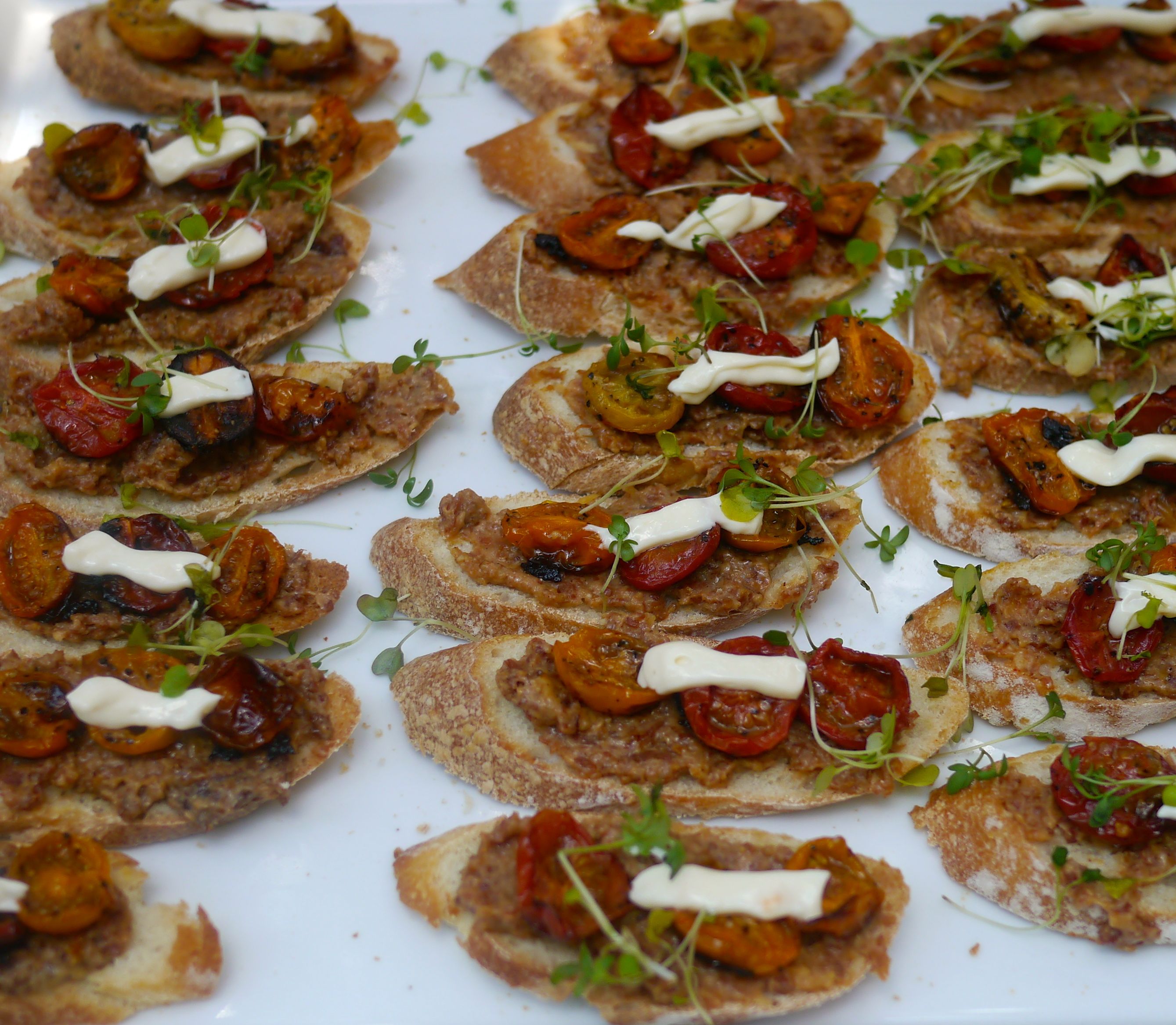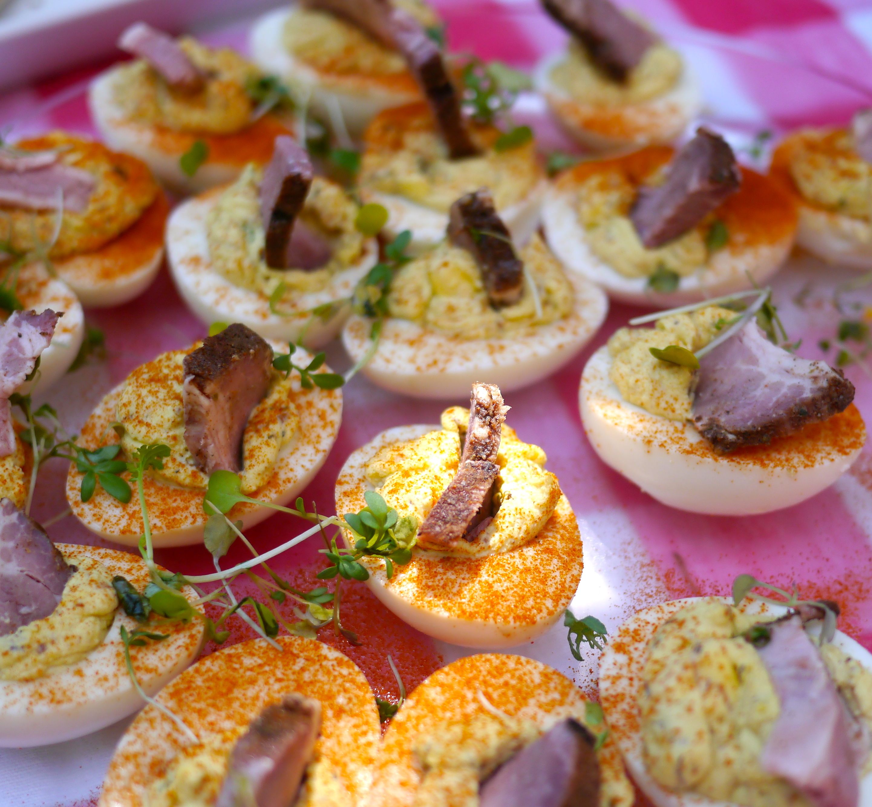 We began with nibbles that included Goat Cheese Log with French Thyme and Bacon, Deviled Eggs with Tasso Ham and BLT Canapes made with Bacon Jam, Oven Roasted Tomatoes, Garlic Aioli and Micro Greens. Yes, in the south Bacon was a staple before it became trendy and got put on donuts and in ice cream.