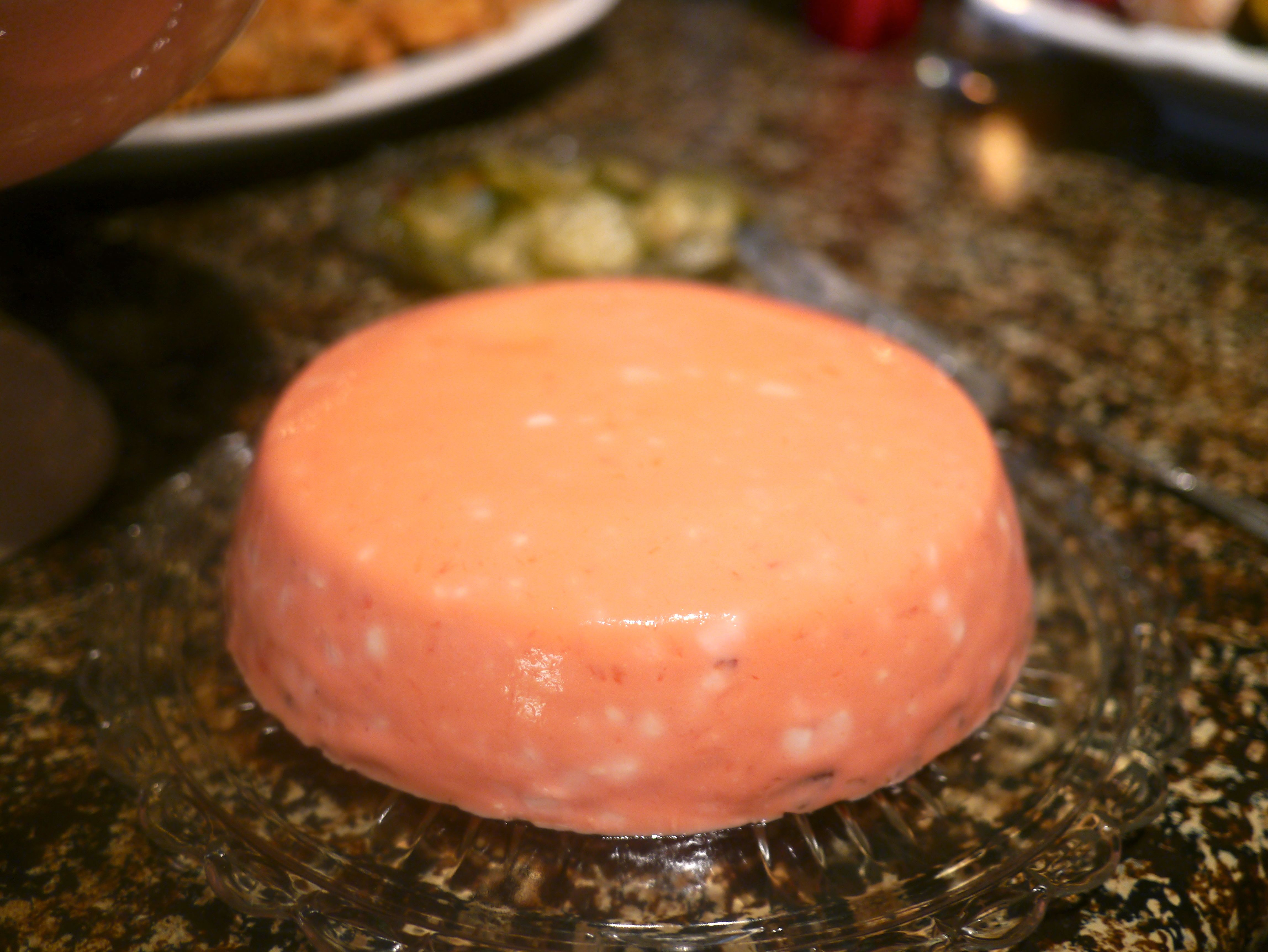 This is mother’s “green salad”…that old traditional Lemon-Lime Jello Salad made but with Strawberry and Orange jello…as I heard one guest say…to match the flowers!!!