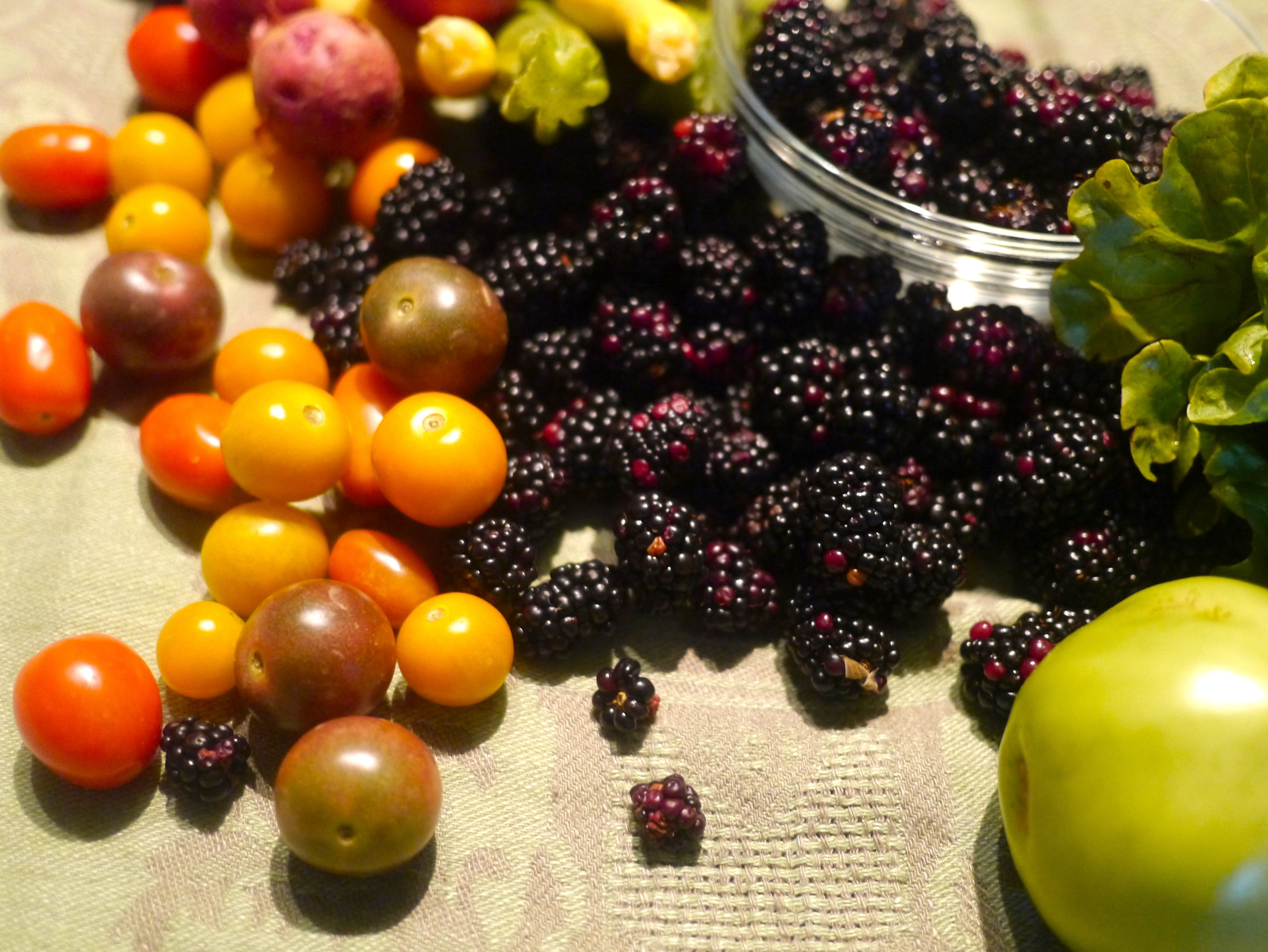 We’re beginning to see tomatoes…small and/or green but summer tomatoes, nevertheless. And, wild blackberries…Oh My!!!