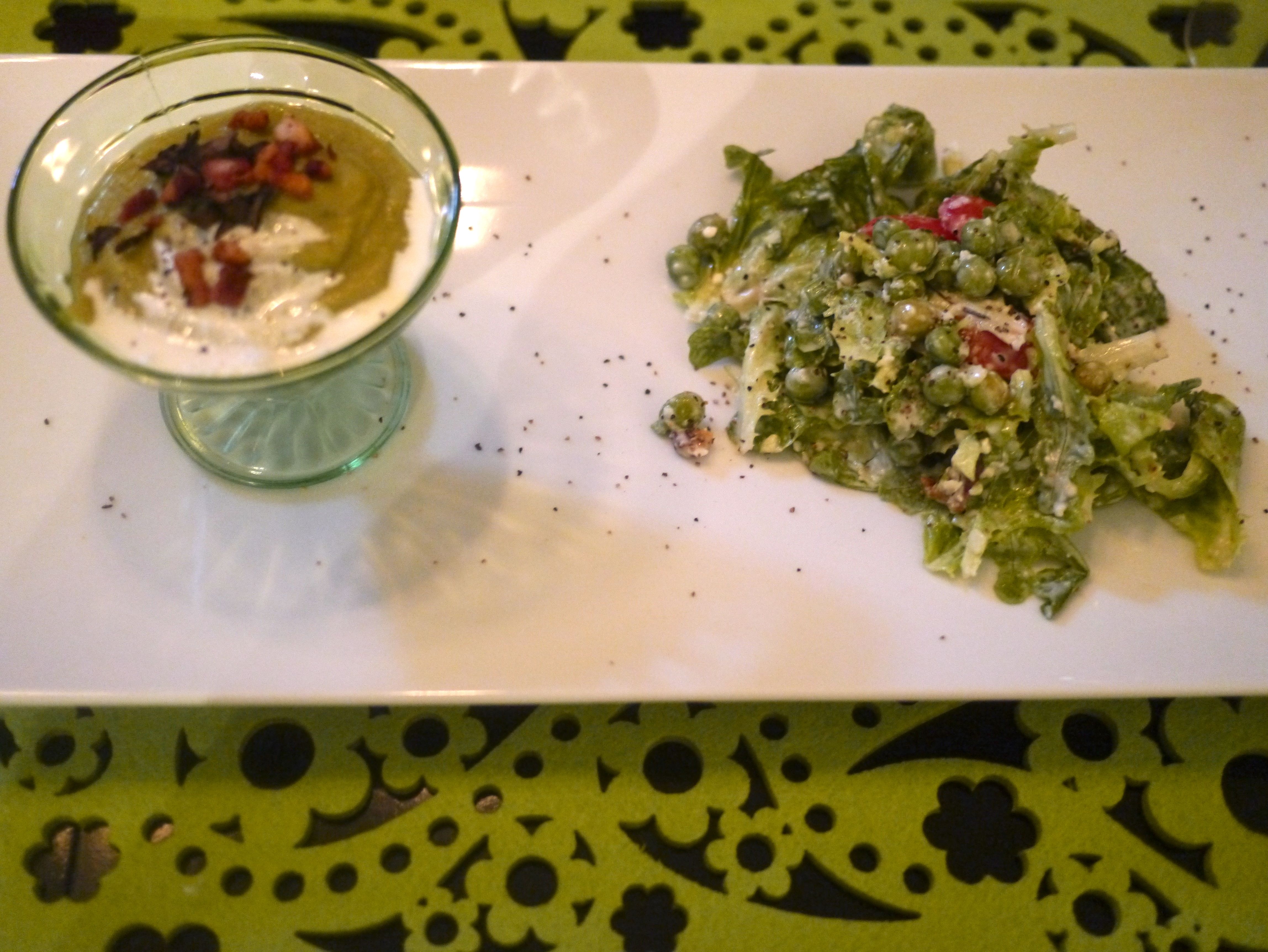 Cold Spring Pea Soup with Chanterelle Cream and Crisp Pancetta & Traditional Spring Pea Seven Layer Salad
