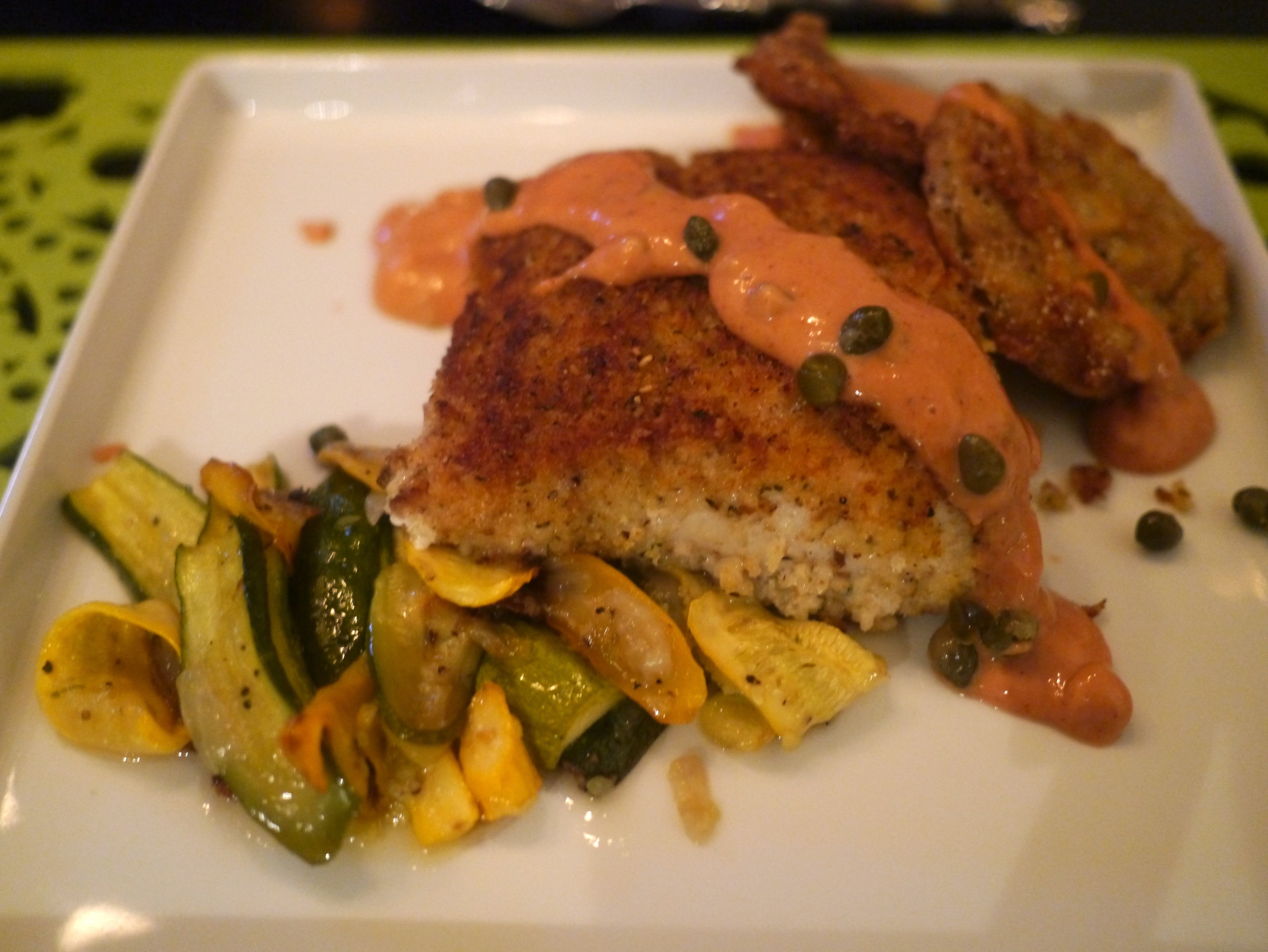For the entrée we had Pan-Seared Amberjack and Fried Green Tomatoes with Chipotle Remoulade and Roasted Summer Squash, Zucchini and Vidalia Onions