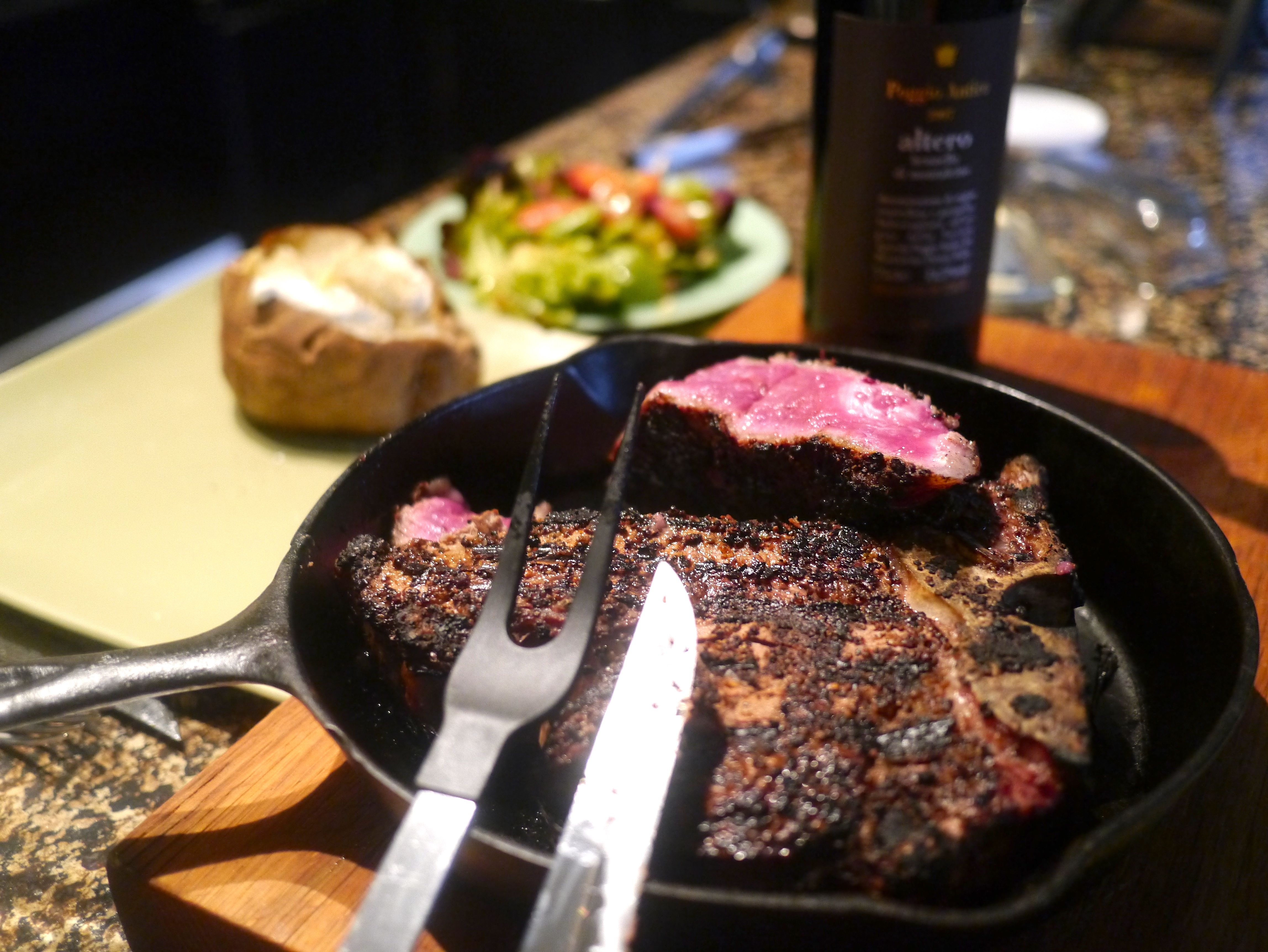 Sunday night it was just the two of us. Every now and then we enjoy remembering one of our favorite places in Italy by re-creating their Bistecca Fiorentina. It’s really a simple treatment of a great cut of meat; the porterhouse. We have the butcher cut a 2″ thick steak, season both sides with kosher salt and black pepper and let it come to room temperature. Pre-heat the grill to 500 degrees and cook steak on each side for four minutes. Bring the steak in and place it in a black skillet that has also been in a 500 degree oven. Drizzle with extra virgin olive oil and enjoy one of the gems of Tuscany. We were simple last night with a baked potato and a “fruit” salad…fresh greens, baby heirloom tomatoes, watermelon, strawberries, grapes, avocado, bleu cheese and honey mustard vinaigrette. To bring an end to a weekend of enjoying life we opening a bottle of the Poggio Antico Altero…Spectacular!!! Thank you Dr. Charles King for introducing us to PA.