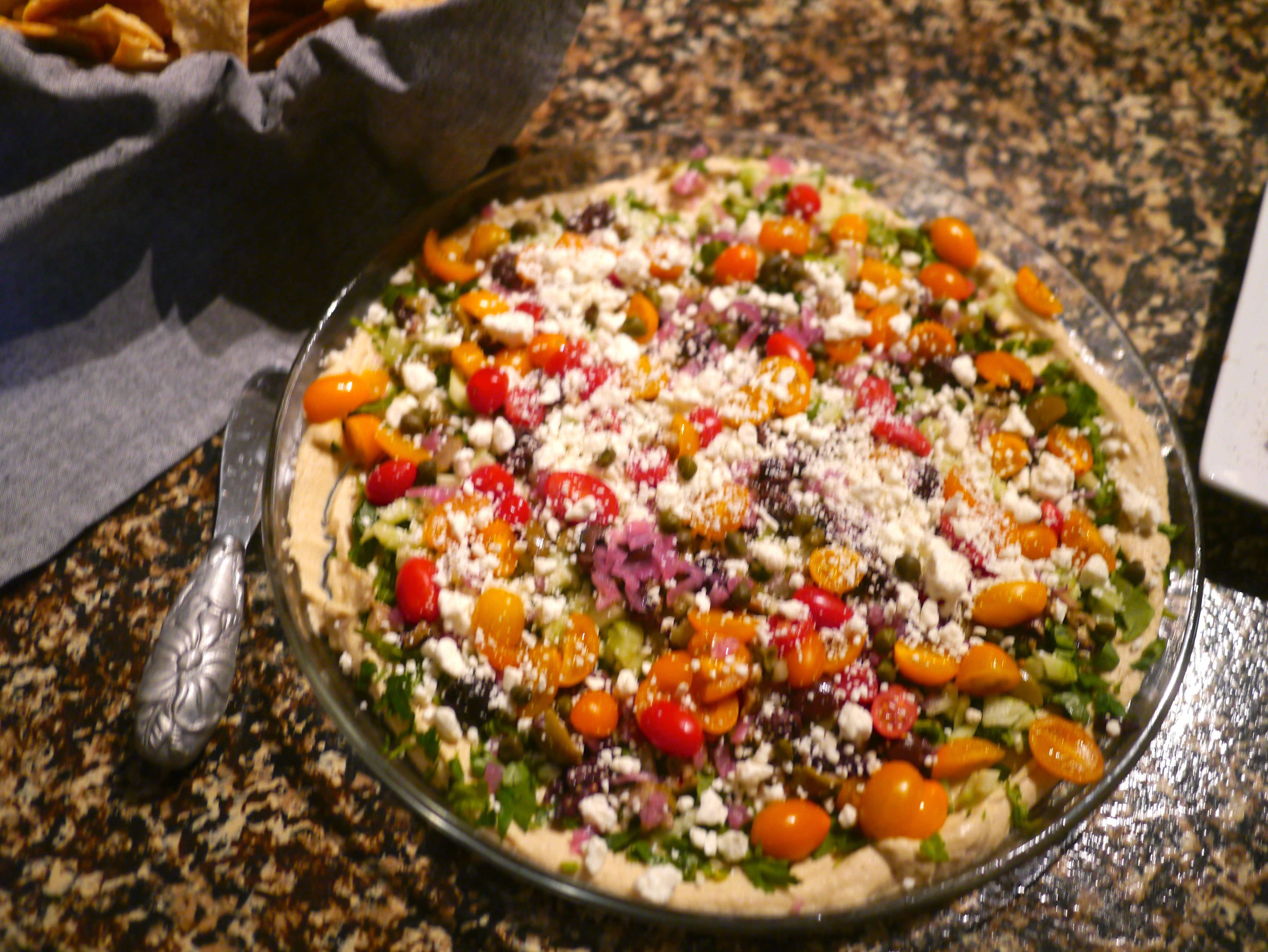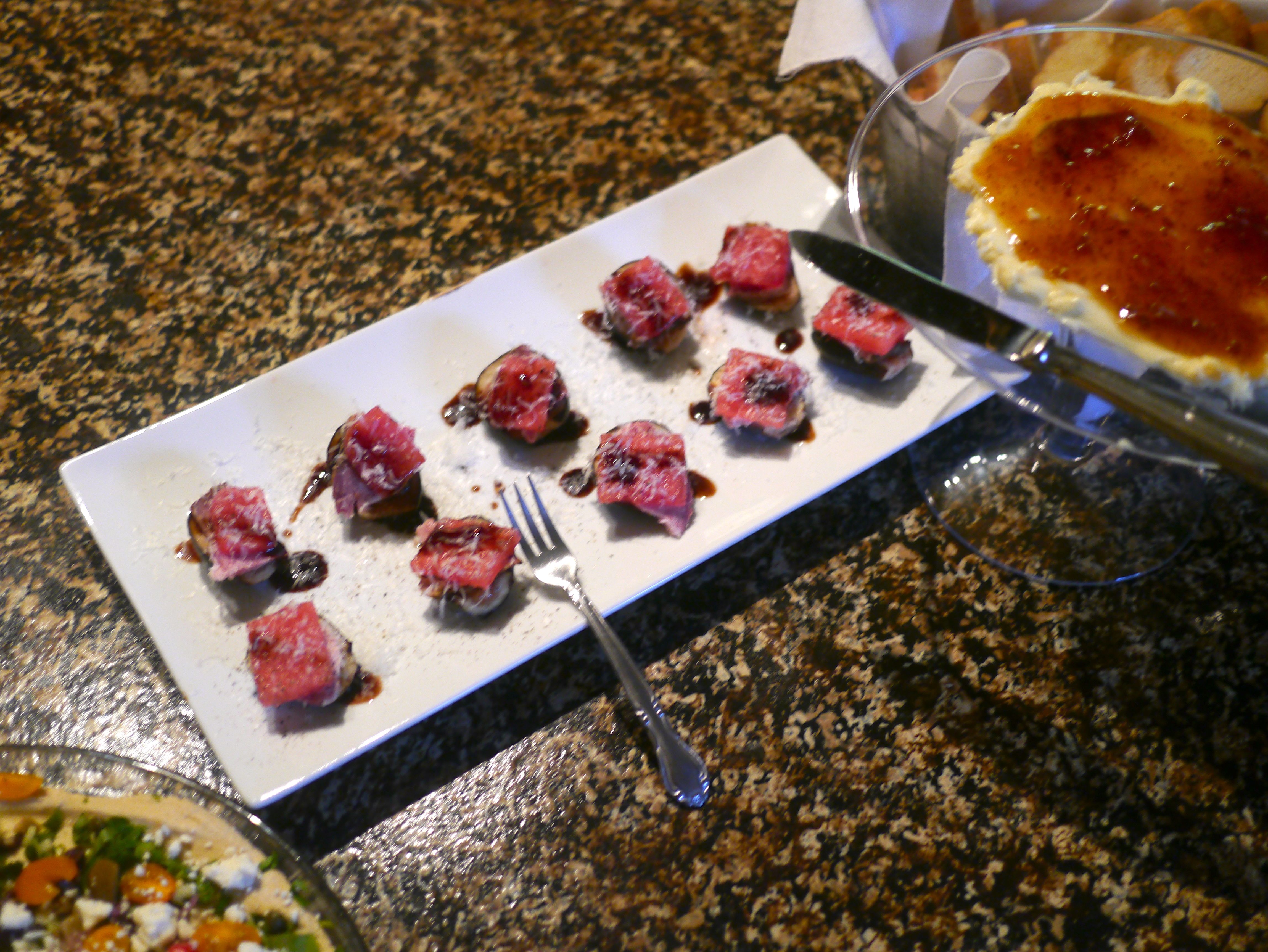 Double Creme Brie with Fig Preserves…Fresh Figs with Tasso Ham, Watermelon and Parmesean…Mediterranean Seven Layer Dip