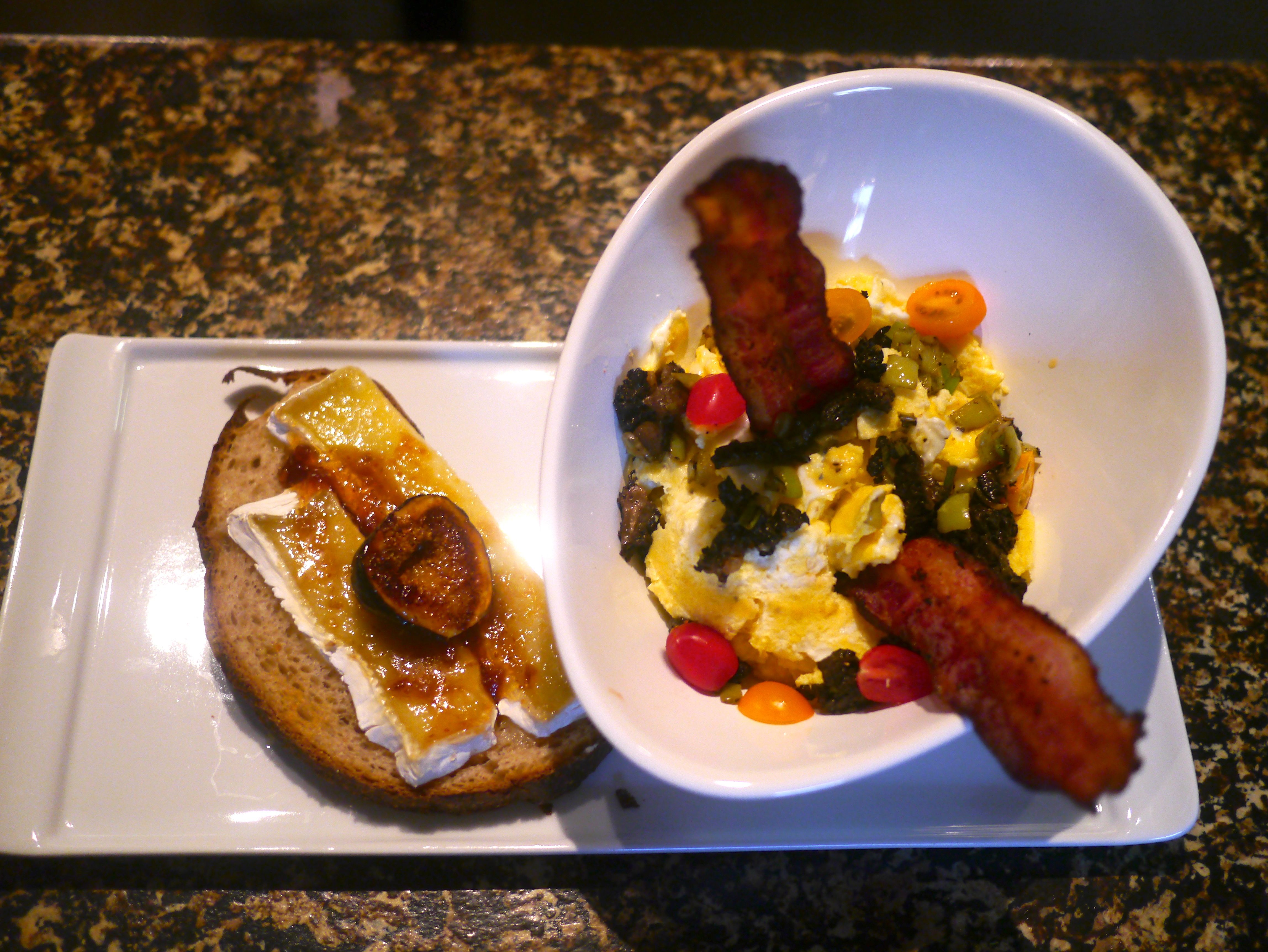 Breakfast Bowl…Creamy Cheese Grits topped with Scrambled Eggs, Morel Mushrooms, Banana Peppers, Scallions and Baby Heirloom Tomatoes with Applewood Smoked Bacon and Toast with Brie, Fig Preserves and Roasted Fig