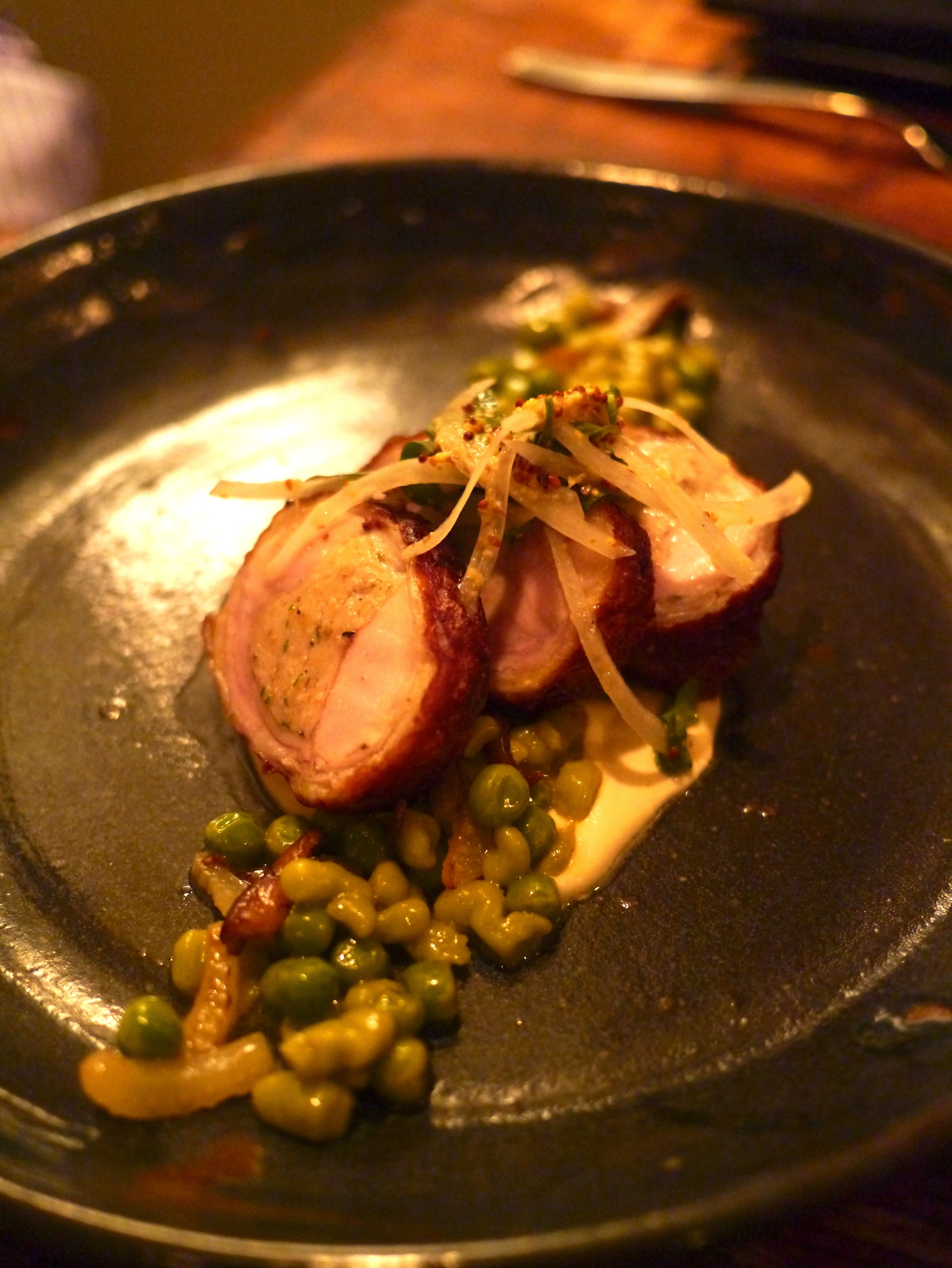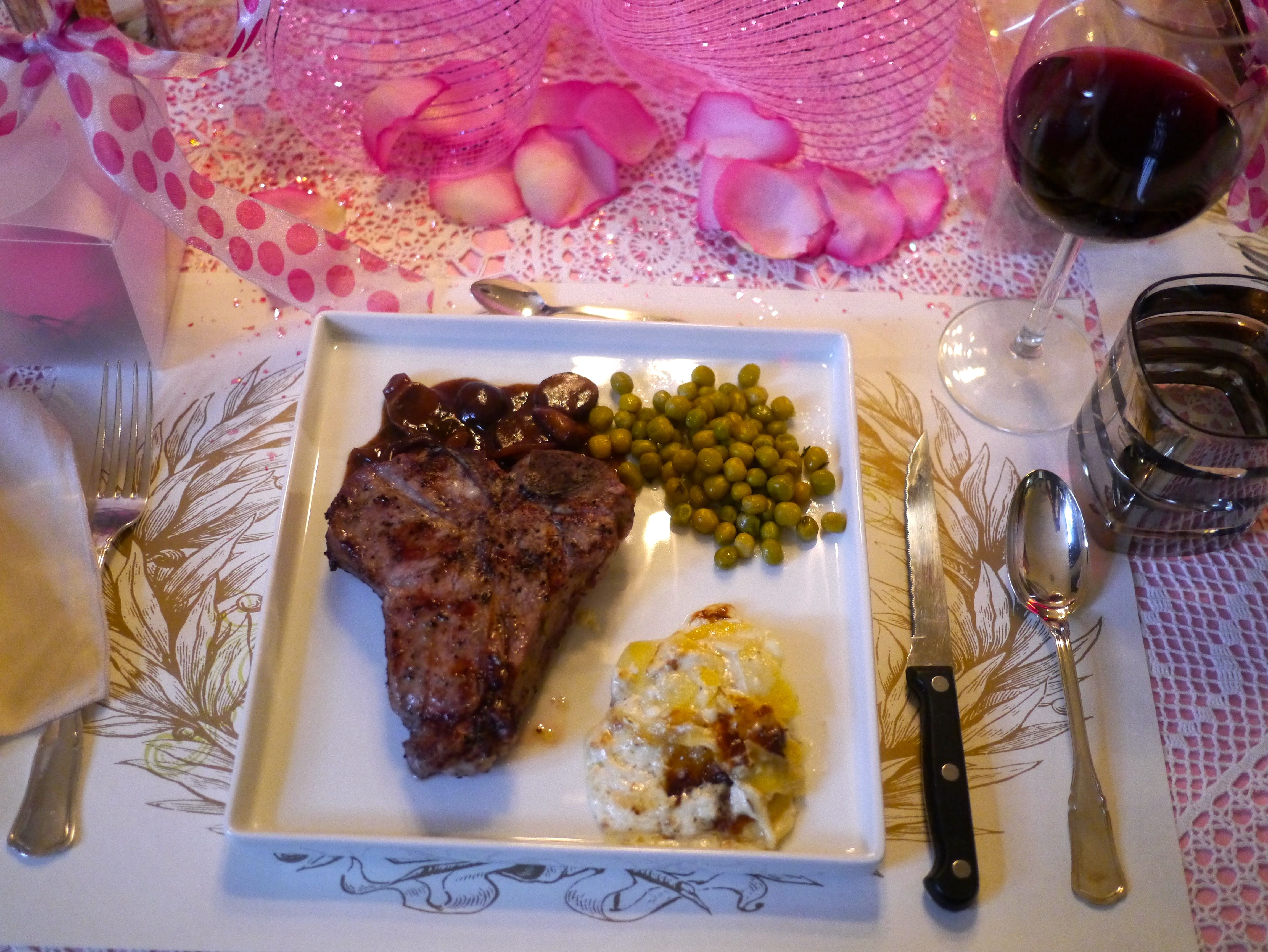 The entrée was Grilled Veal Chop with Dauphine Potatoes and Thyme Scented Spring Peas.