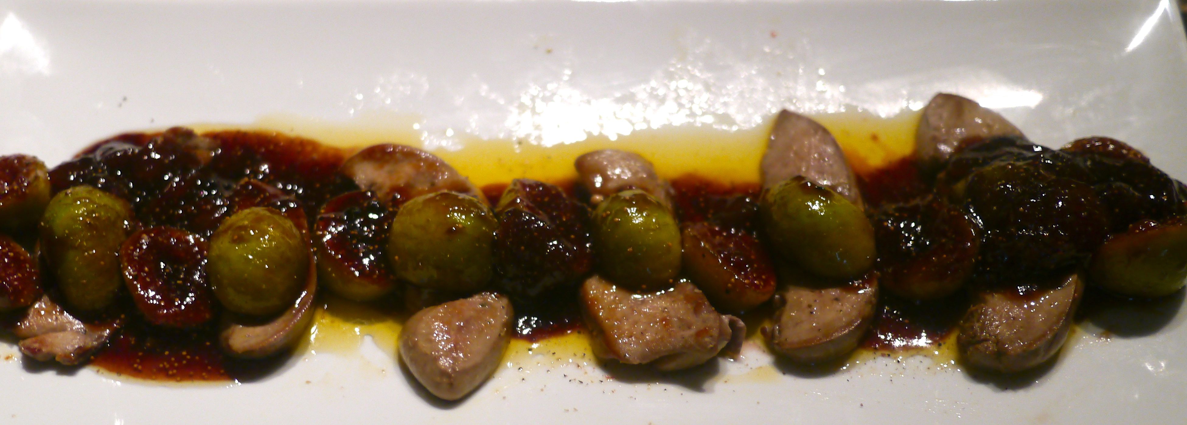 We started with some charcuterie of our own design. Prosciutto with Cambazola and Homemade Clementine Preserves (Thank you Uncle Bucky); Goat Cheese Ball with Bacon, Thyme and Cracked Pepper, Homemade Pickles and Little Bite Bakery Lavash. Then, Pan Seared Foie Gras with Brown Sugar and Balsamic Glazed Front Street Figs.