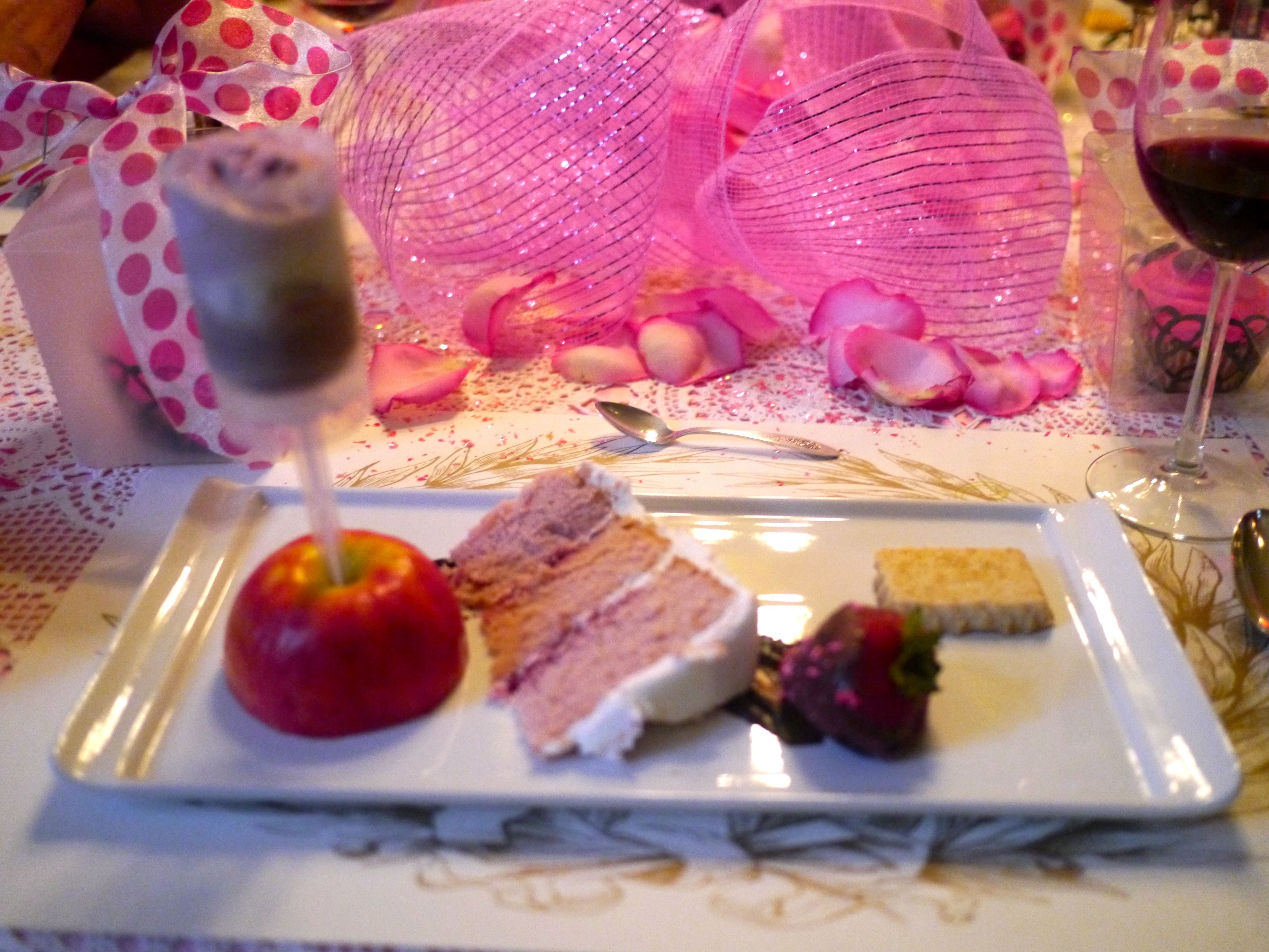 And, the birthday girls mom and I got carried away on the final course. It’s a Neapolitan “Push-up” with Strawberry Birthday Cake, on Chocolate Rum Sauce with a Sparkly Chocolate Dipped Strawberry and Homemade Shortbread…the textbook definition of “it’s not done ’til it’s overdone!!!