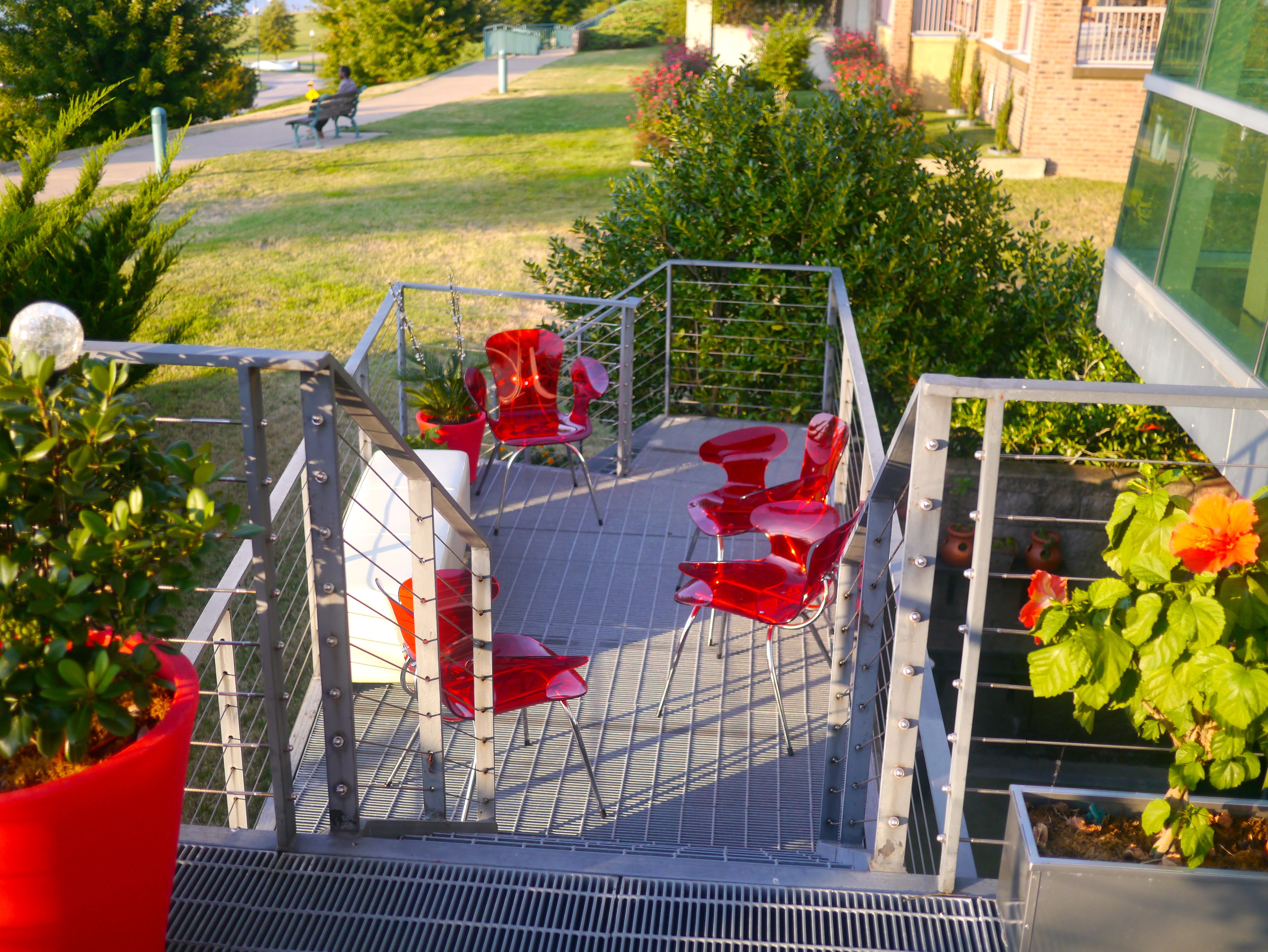 The terraced deck is the perfect place for entertaining. I found these red acrylic chairs at Maison Objet in Paris. Everyday they circle the breakfast table but for the party they offered a lively cocktail area on the deck.