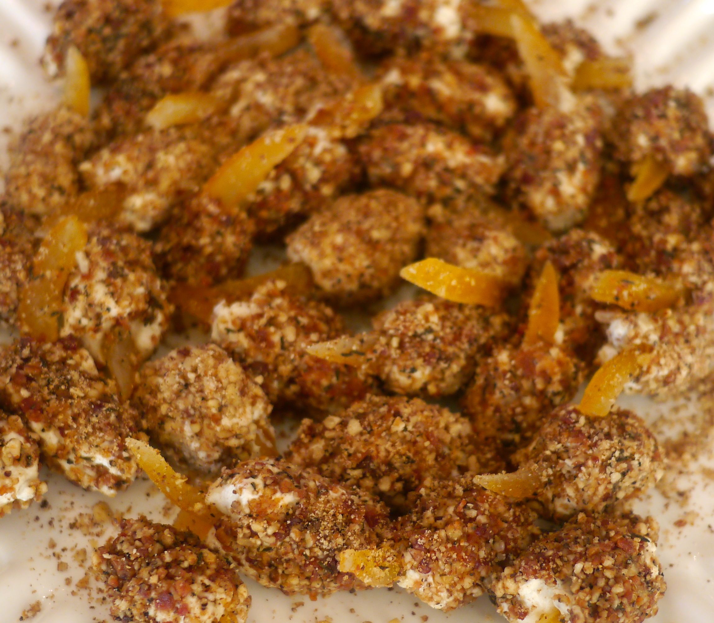 Candied Orange Peel wrapped with Goat Cheese, Thyme, Bacon, Pecans and Black Pepper