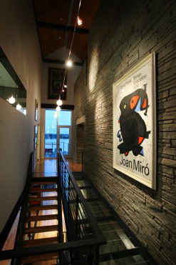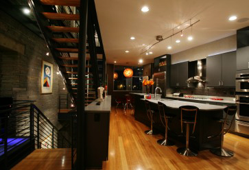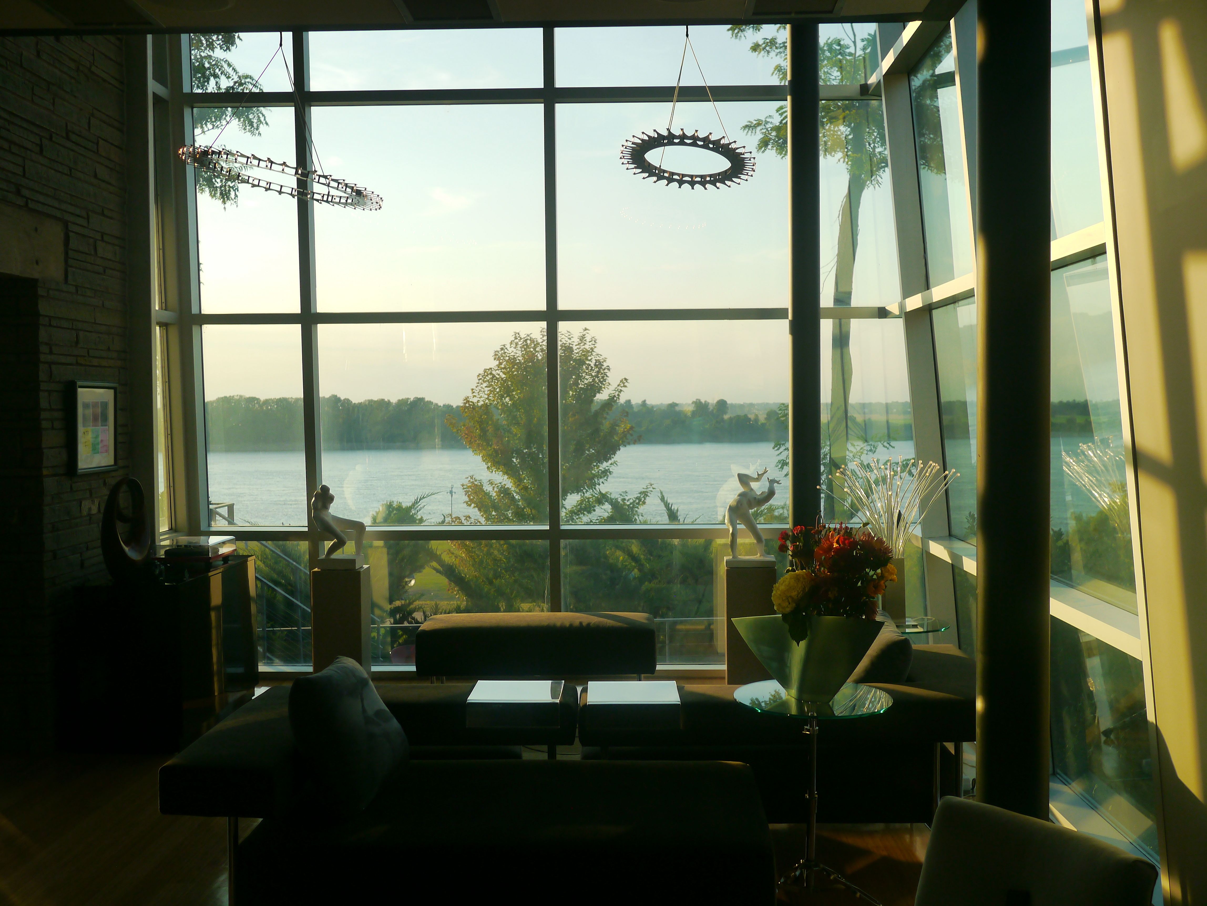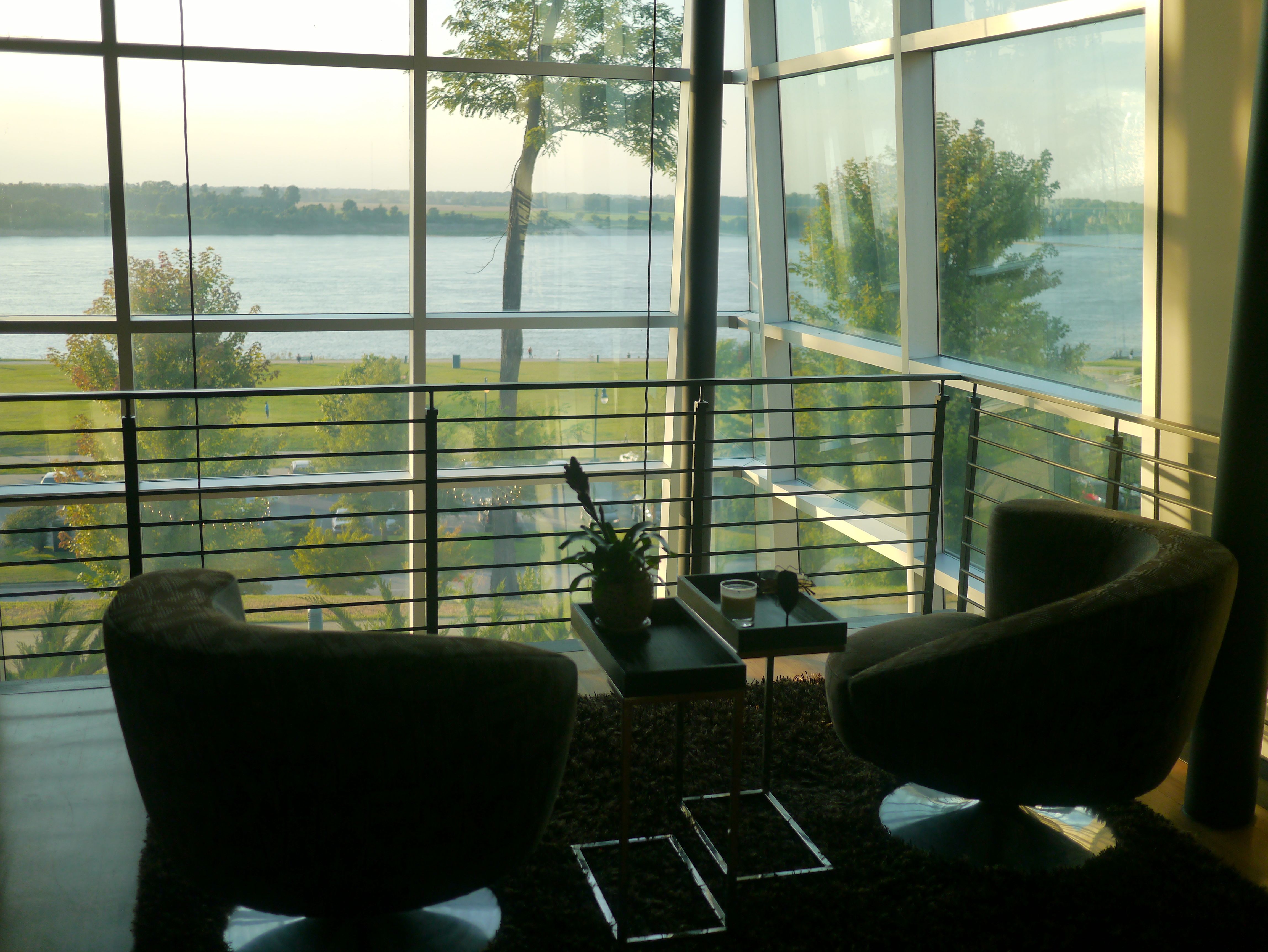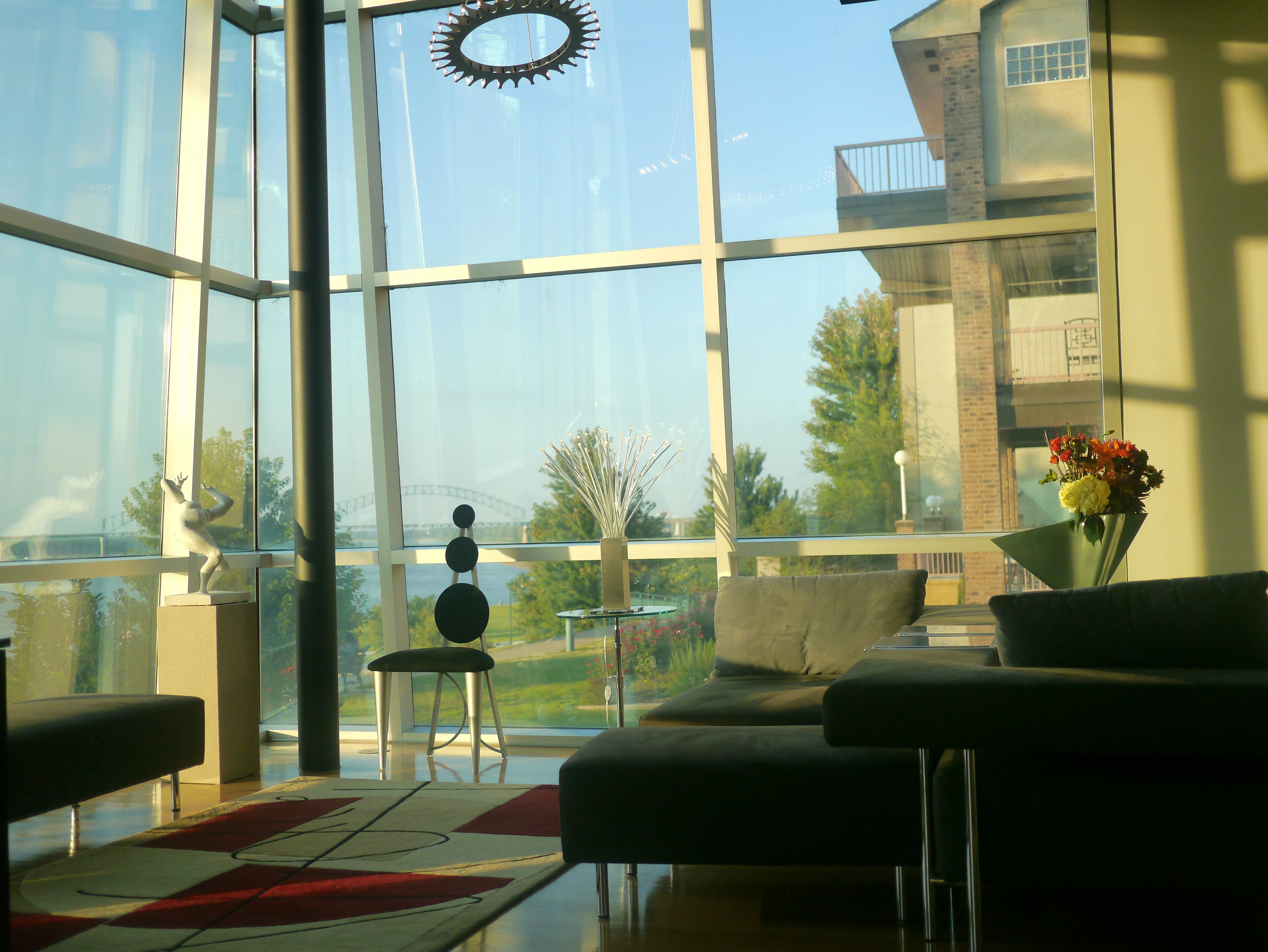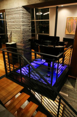 The main floor offers a place of comfort that not only allows one to enjoy the view but to also relax to the sounds of a baby grand hovering over a glass floor accented with LED lighting. The “sprocket” light fixtures were designed to mimic the engineering brilliance of the “new” Hernando-Desoto Bridge.