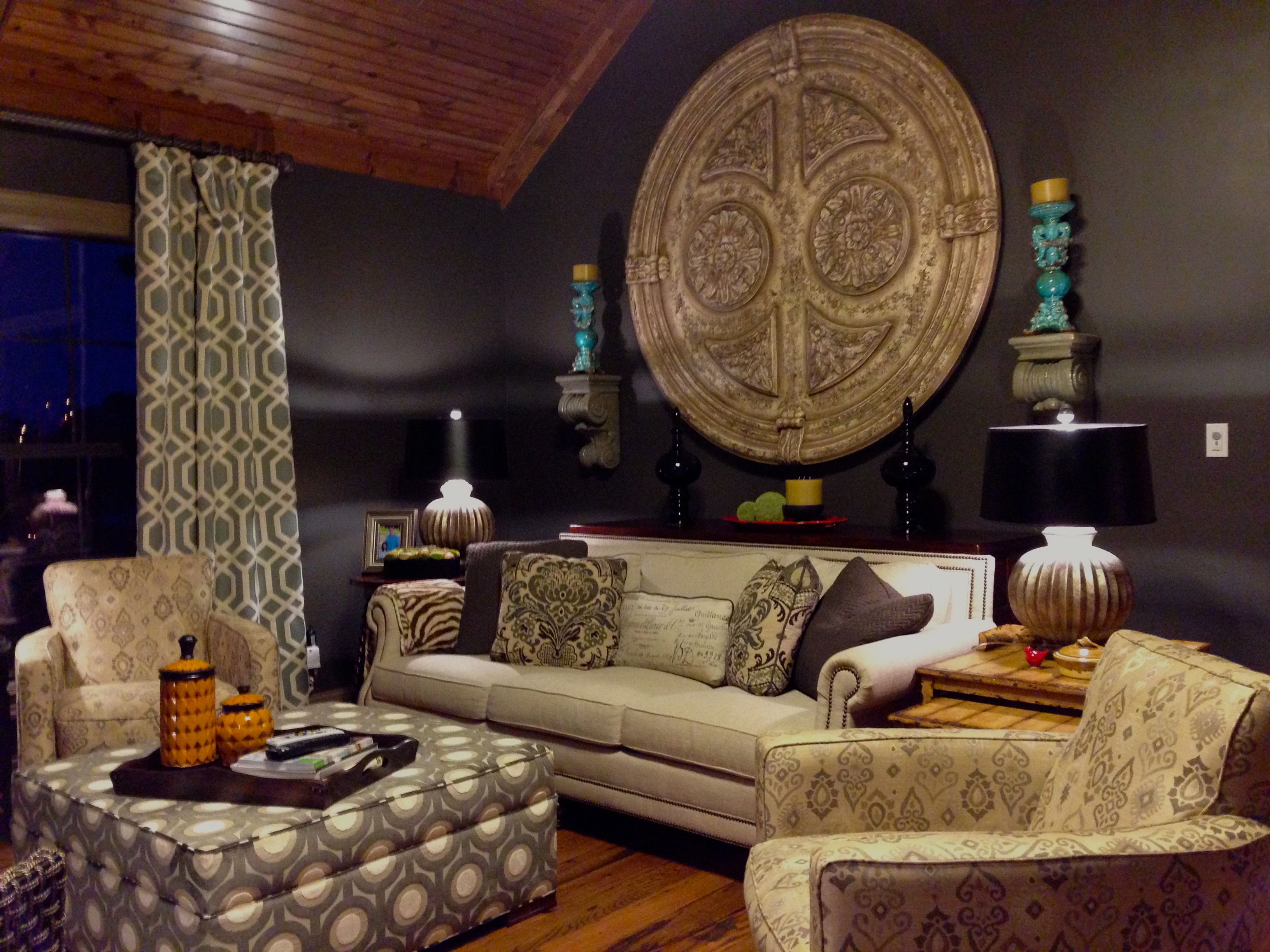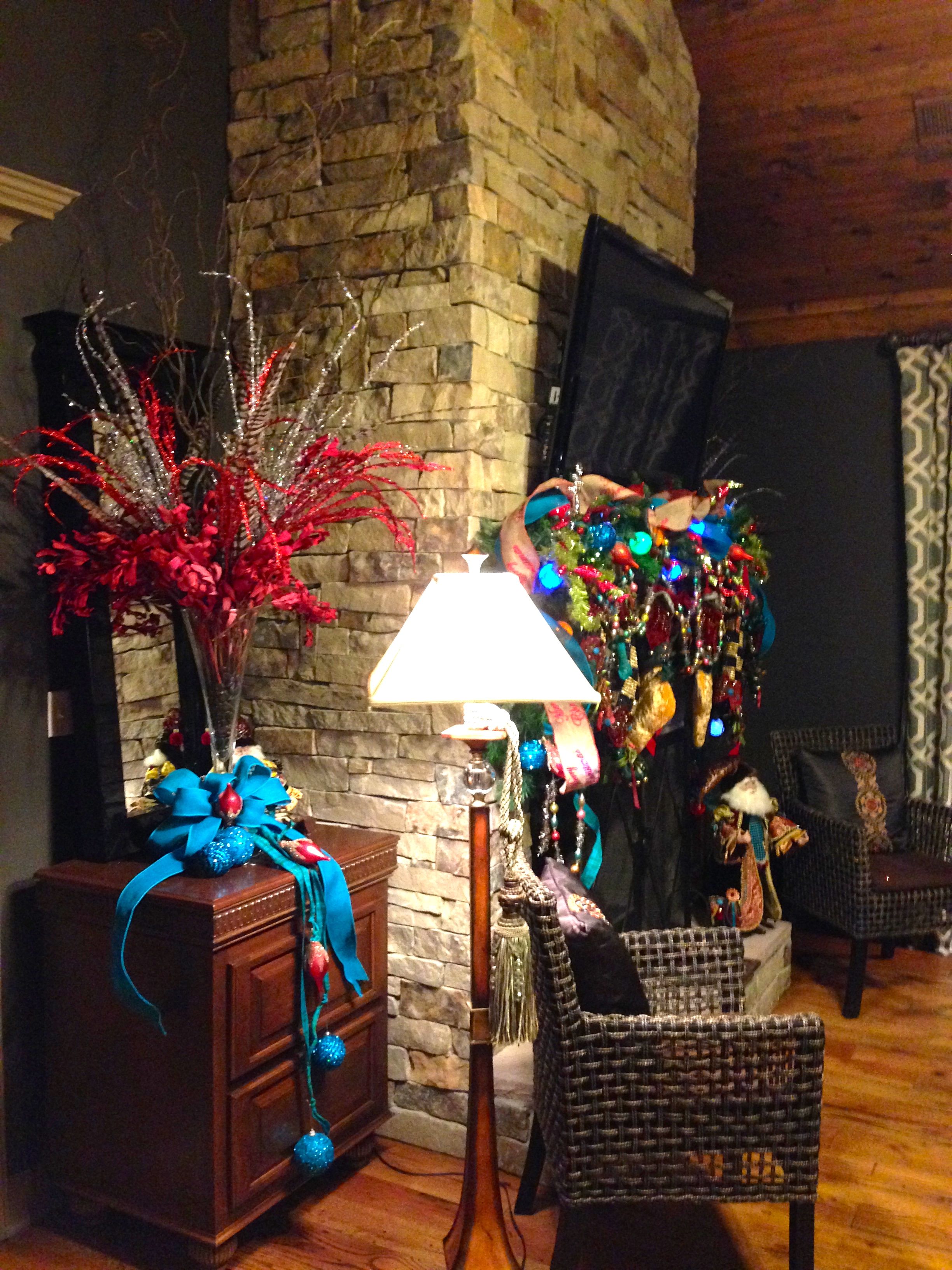 Adding a bit of drama for the holidays makes a beautiful room all the more welcoming. The stockings for two and four-legged family members are from Katherine’s Collection. The colored ball lights from Fred’s Dollar Store. Lights are lights are lights. I find the dollar store and drugstore chains have a much better selection than the big box or specialty stores…and, if they only last one season you didn’t spend so much money you feel like you have to spend hours trying to repair them.