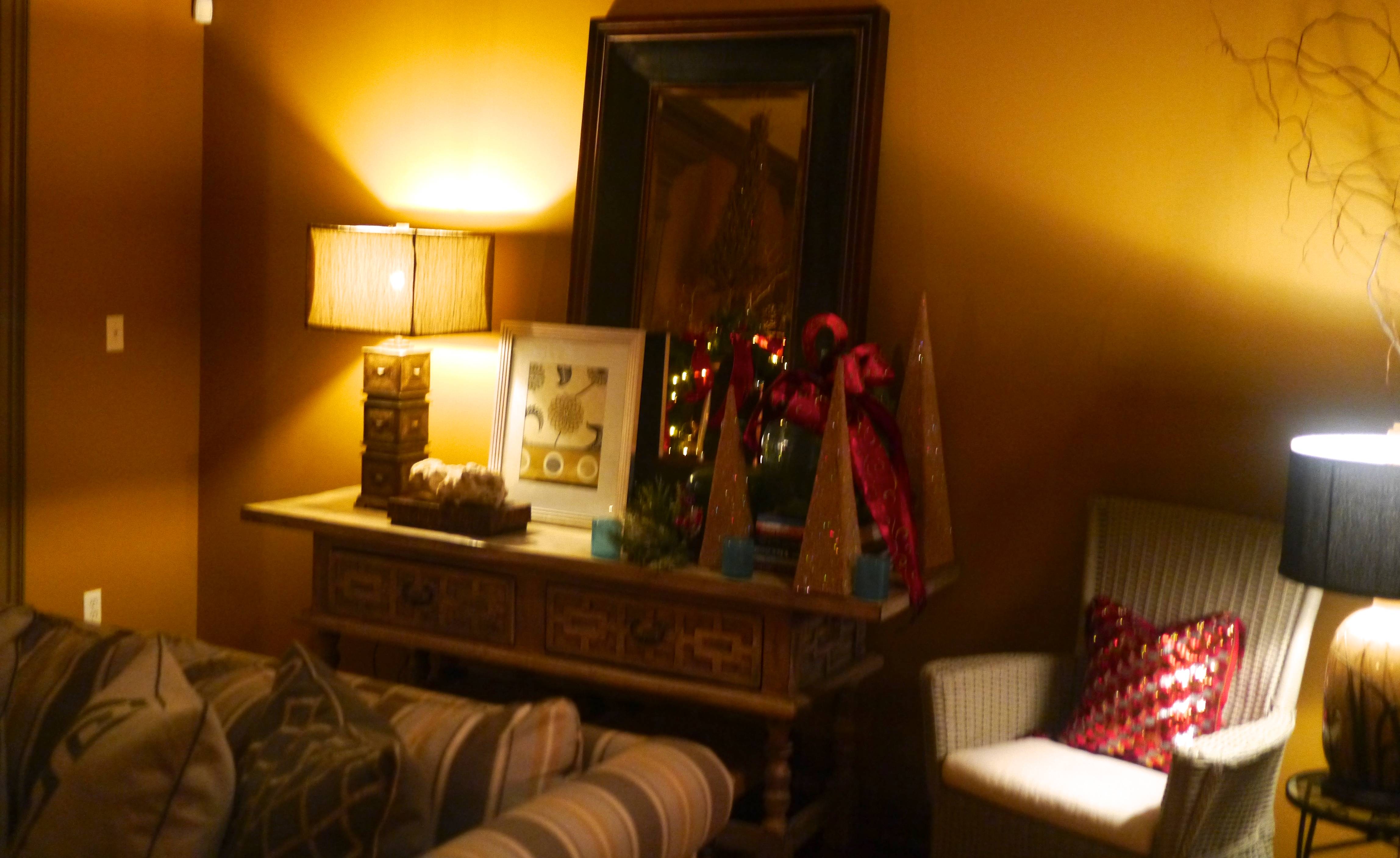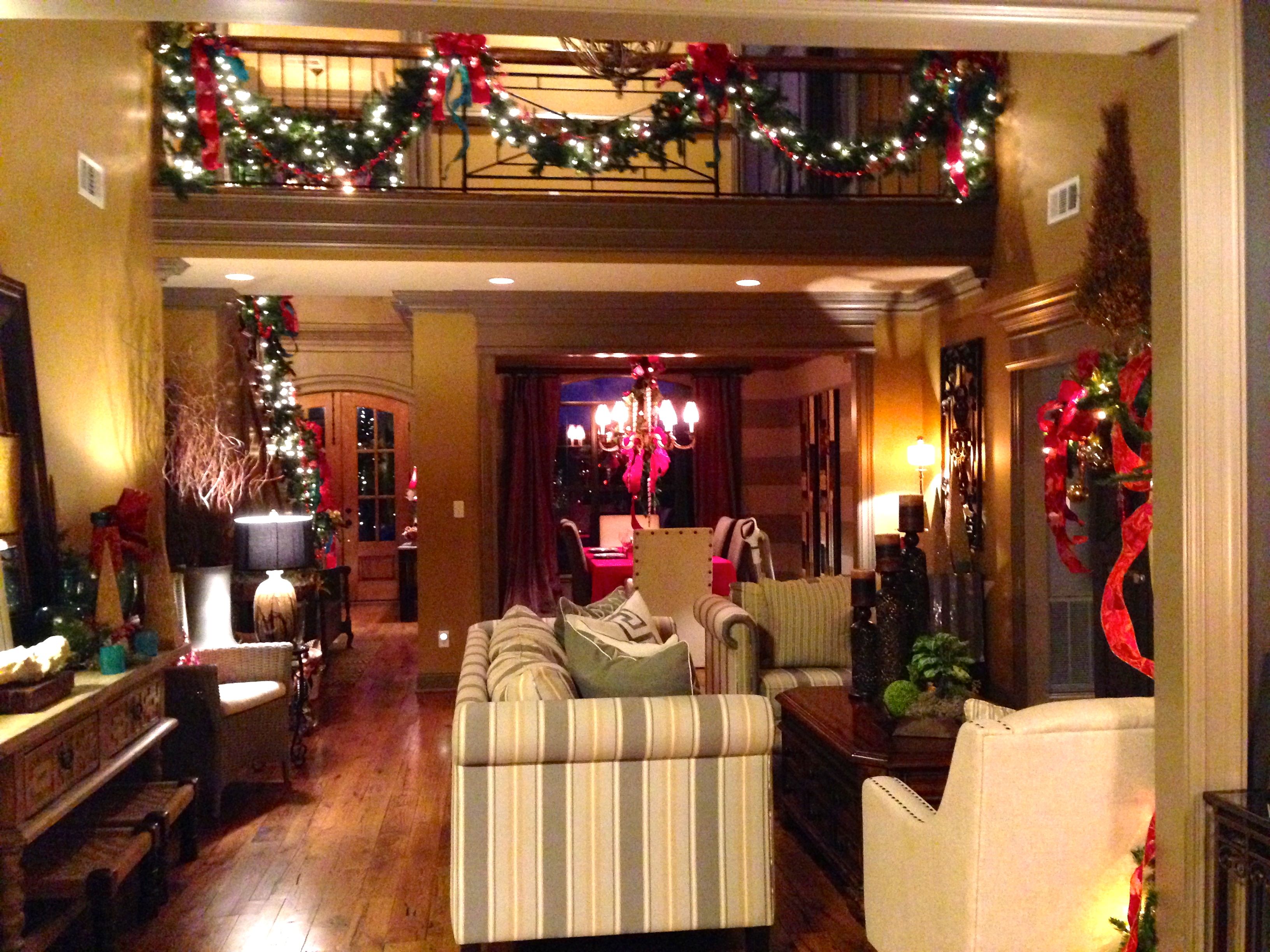 Garlands, ribbons, glass ornaments and just a little glitter make the Living/Dining combination magical.
