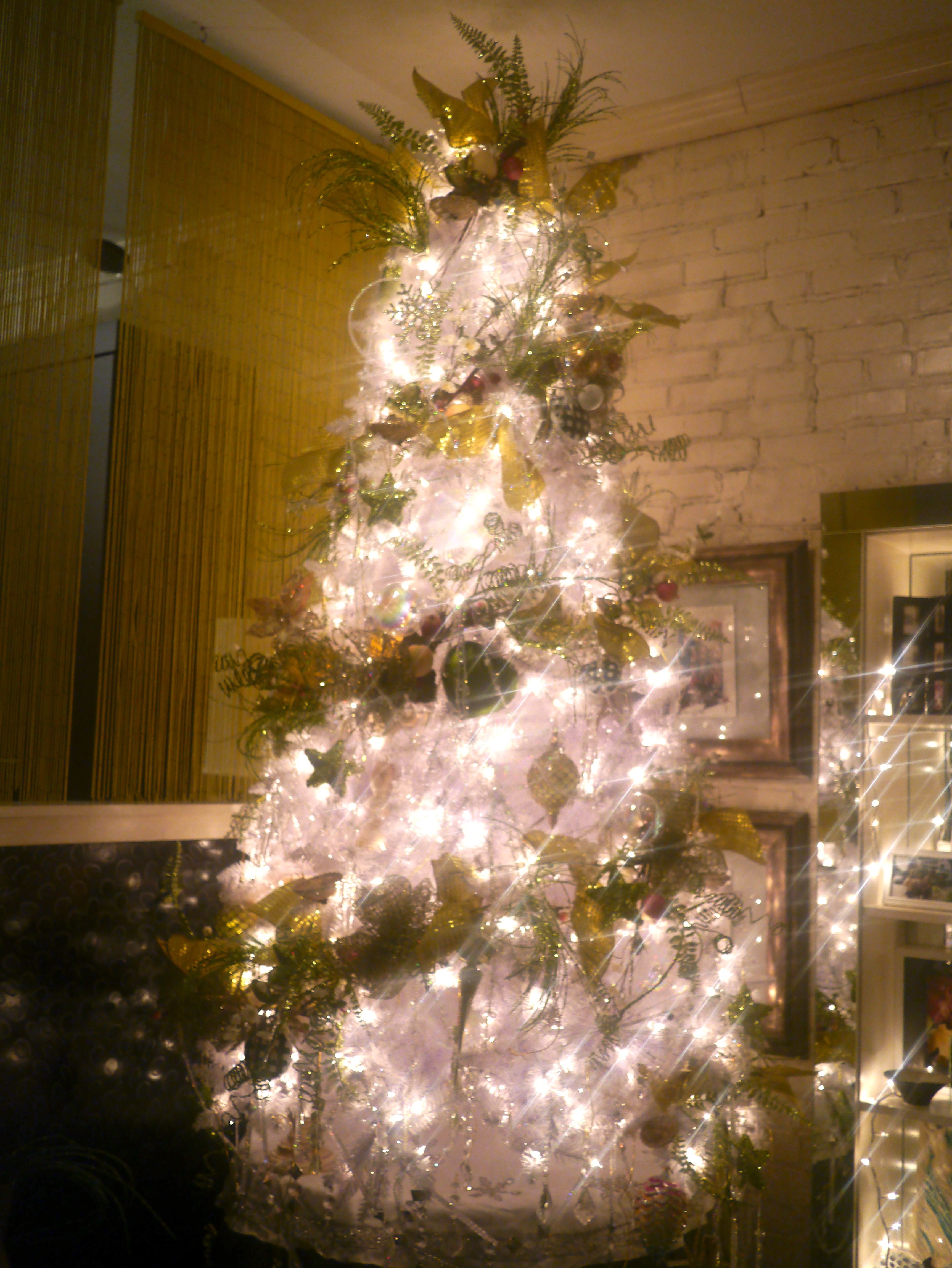 Finally, the tree is all aglow. The white tree with crystal lights is dressed primarily in Chartreuse but glistens with crystal ornaments, baubles, garlands and some precious collectibles.