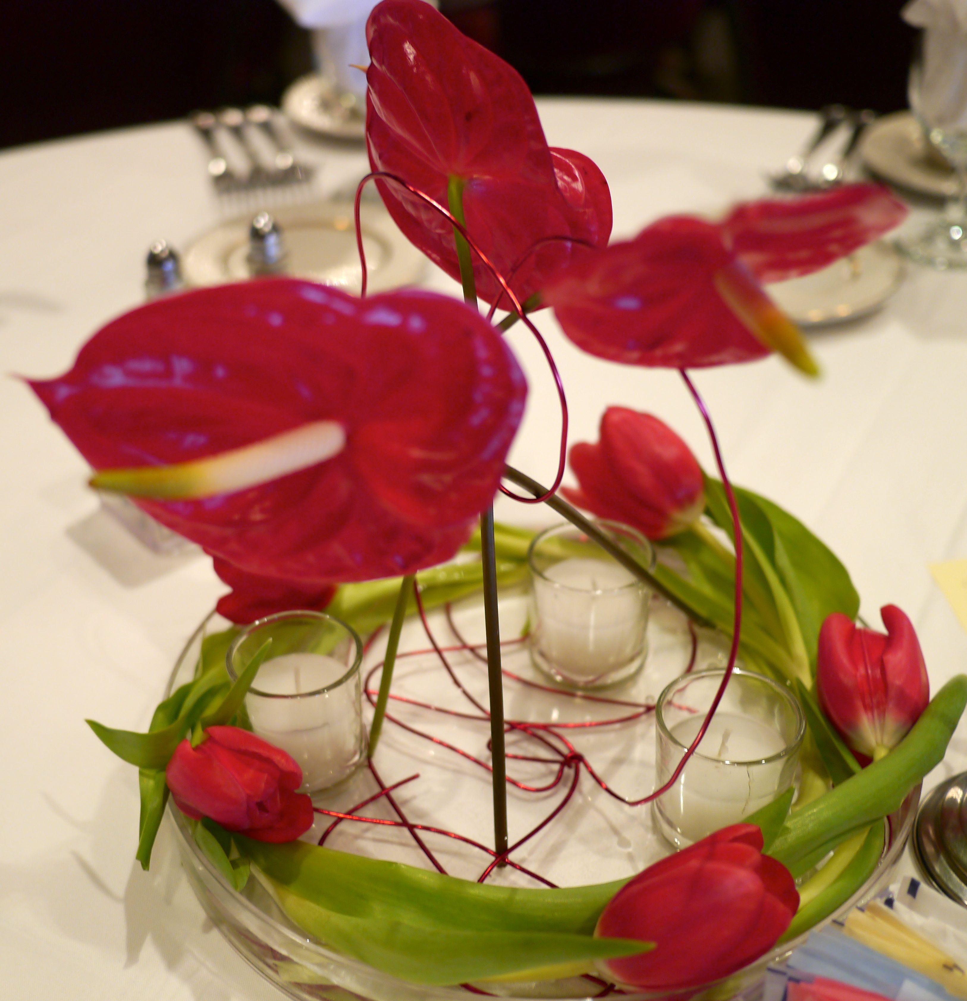For the table we made wire hearts and nestled tulips and anthuriums amongst them.