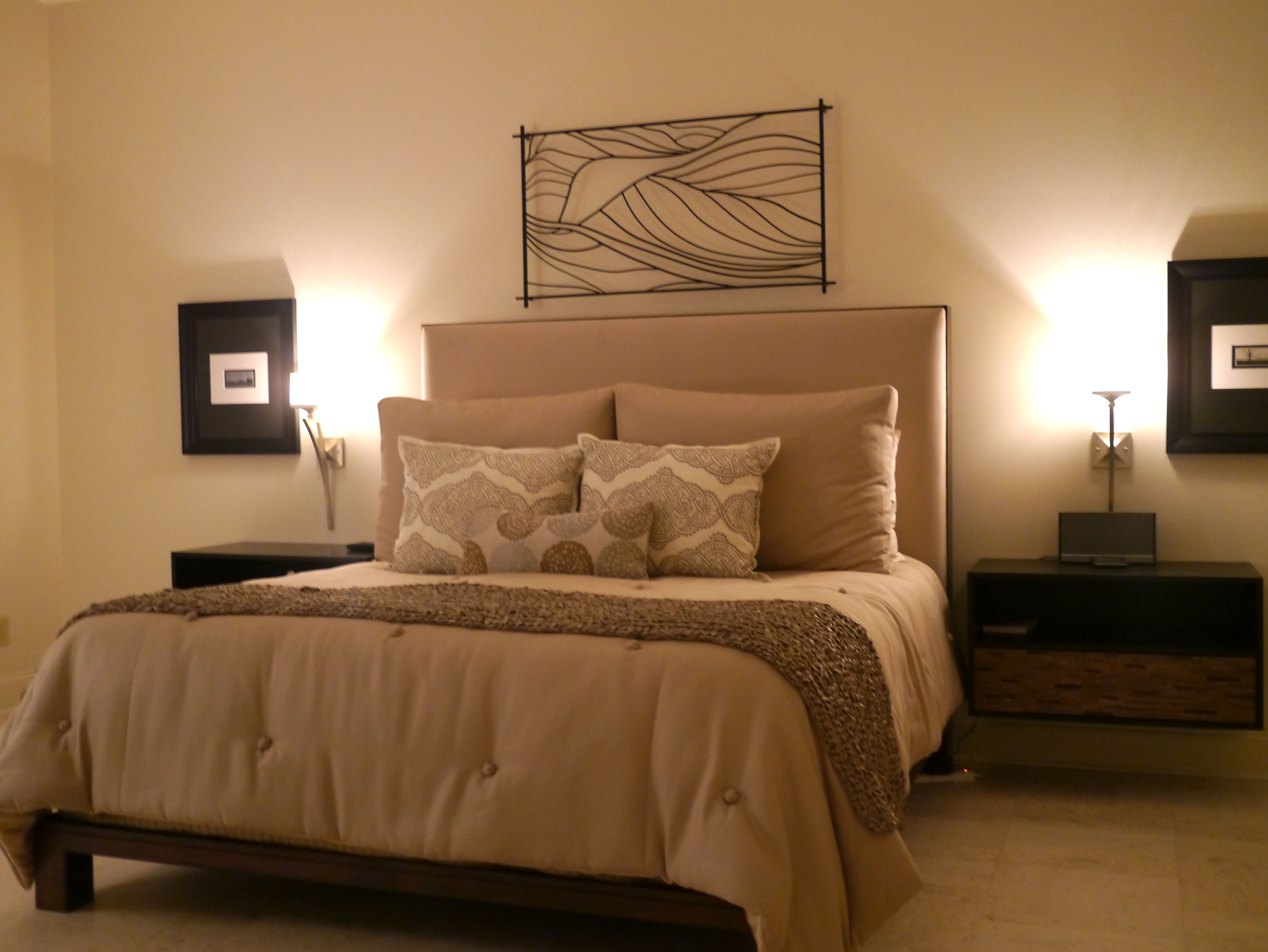 Ann Gish bedding, Ercole bedside table and a custom designed Lisa Jarvis I-Beam console accompanied by the art of Michael Banks, Rick Anderson and Jerry Couillard.