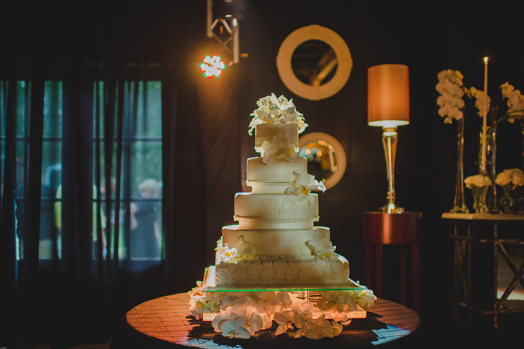 The bride was honored with five tiers of traditional white cake and buttercream wedding cake magic. We gave Holly a swatch of the rose lace from the brides gown and she created an exact replica of the lace in fondant and buttercream.