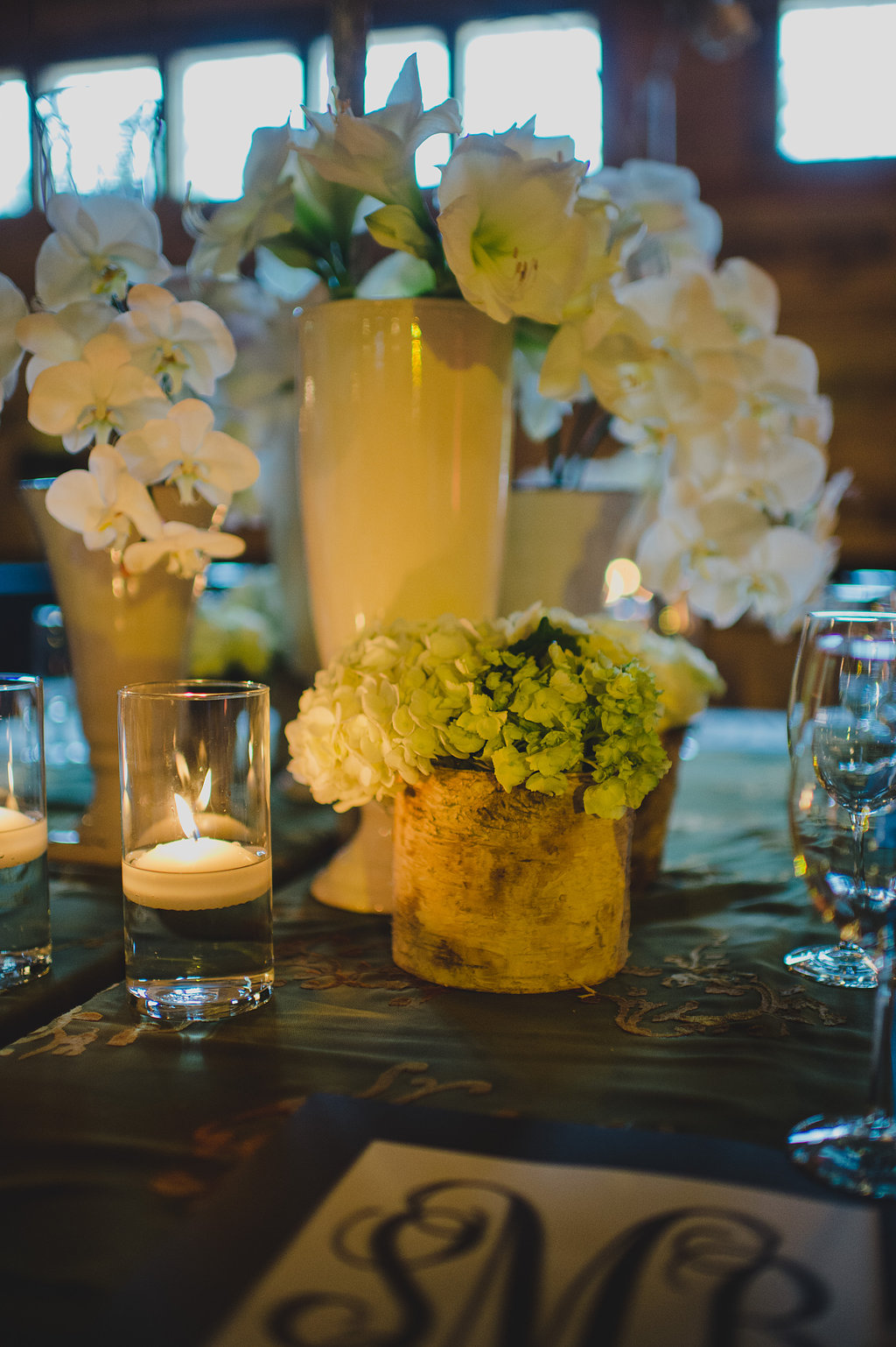 The design of the hall was organized for maximum capacity and flow.  The right side of the hall brought the outdoors in with rose balls, lanterns and strung dendrobium orchids hanging from 12′ dogwood trees.  Urns and cache pots filled with phalaenopsis orchids, roses and hydrangea rested around the base of the trees.