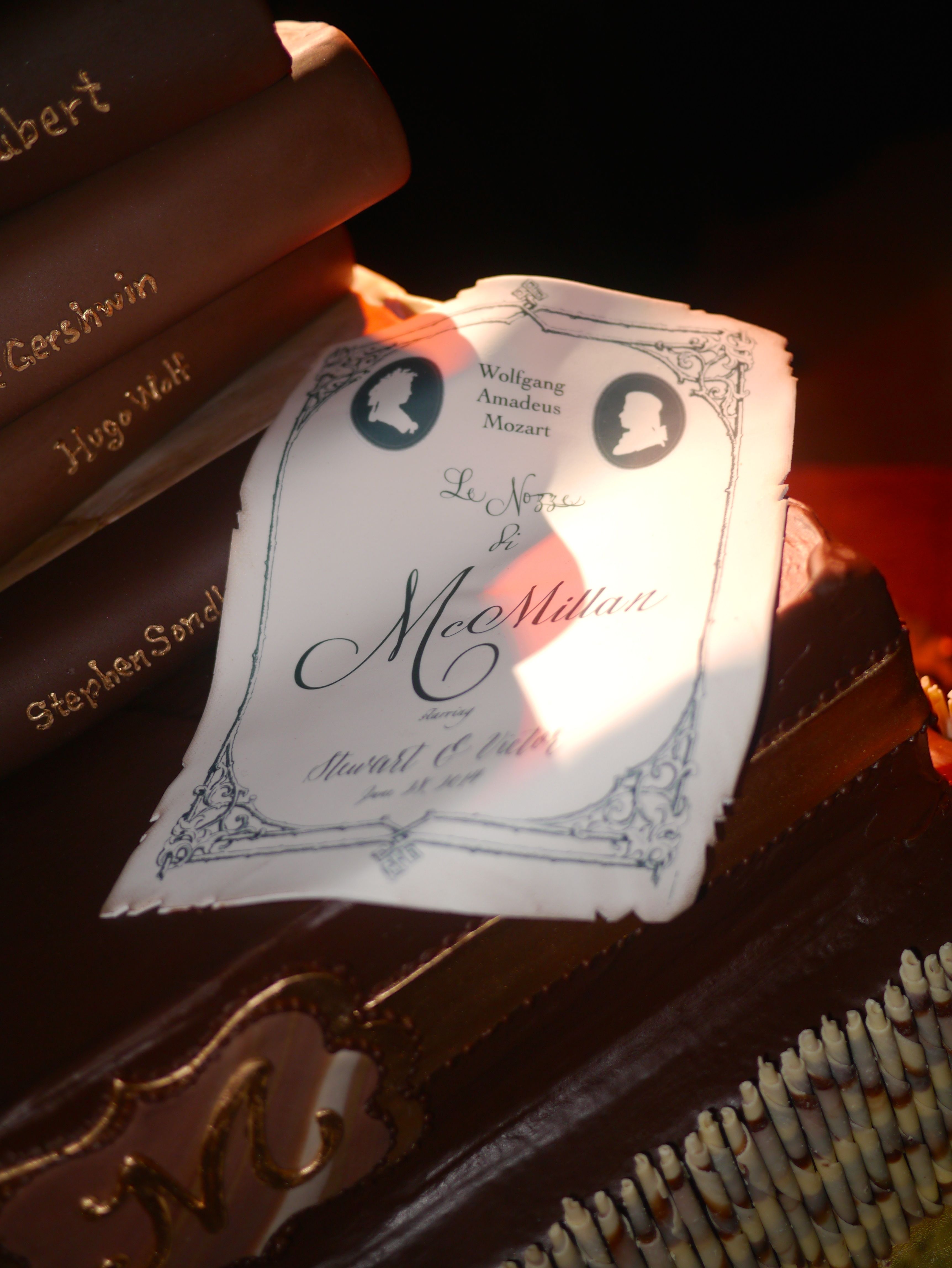 The grooms cake was a symphony of chocolate.  The base of the cake was soldiered with white and dark chocolate “cigarettes”.  The second tier was bathed in chocolate ganache, wrapped with a gold “band” and accented with an M medallion.  The top of the cake was a stack of music scores from the groom’s favorite composers.  Each score was covered in marblelized chocolate fondant and the titles were shown in gold leaf.  Resting on the corner of the cake was the appropriate “program” Le Nozze di McMillan.