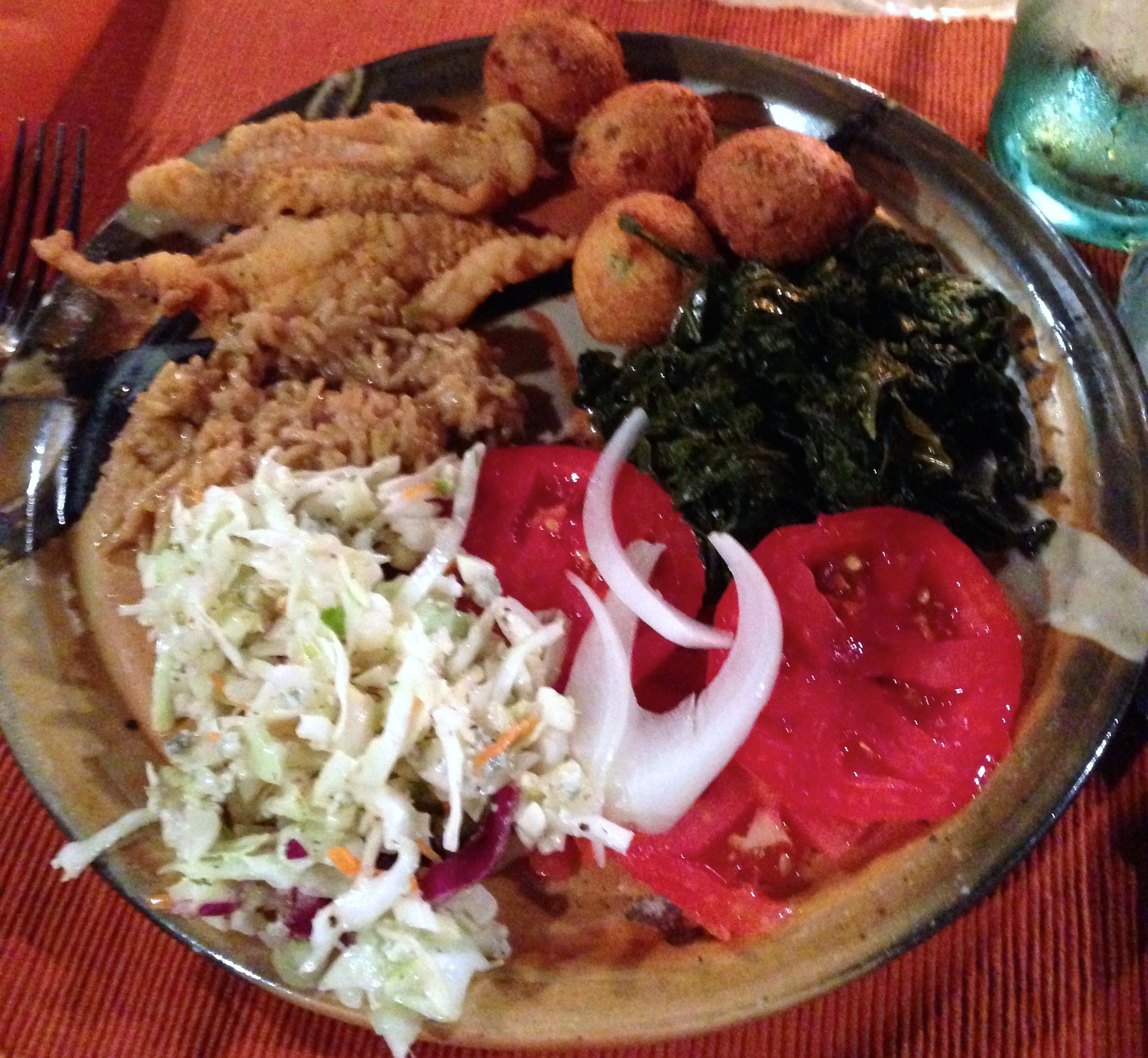 I don’t want to hurt feelings so I can’t say this was my favorite birthday meal. So, I’ll just say I wish I had this plate again, right now. When I was growing up this was the kind of meal we had almost every Saturday night. Catfish, hushpuppies, slaw, fresh tomatoes and onions.  We had french fries but this time the greens and rice elevated this meal way beyond a typical Saturday supper. I am so sorry you don’t get to see the black bottom pie Kirk made for dessert.  We all inhaled it as soon as it hit the table.  Kirk said it’s not as good as what he’s had before. Thus, we highly encouraged him to keep trying!!!  I’ll try to photograph the next one.