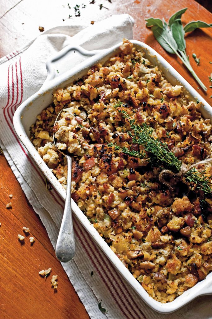 Long story…Reader’s Digest version. We were invited to a friends for Thanksgiving dinner….a Lovely, Elegant evening. A friend of the friend we barely knew brought Oyster Dressing to add to the traditional Thanksgiving bounty. The Oyster Dressing was FABULOUS. Our friend had slaved to entertain in the grandest of style. Yet, all the guests (Tim) wanted to talk about was the Oyster Dressing. Our sweet friend “lovingly” hasn’t let us forget it. And, speaking of forgetting the new friend then which dear friend now tried numerous times to replicate it…failing miserably each time. Fast forward to me finding this Edward Lee version in Garden and Gun. This Oyster Dressing is truly FABULOUS!!! I don’t do the chestnuts because I never remember to look for them in advance but everything else is amazing!!!!