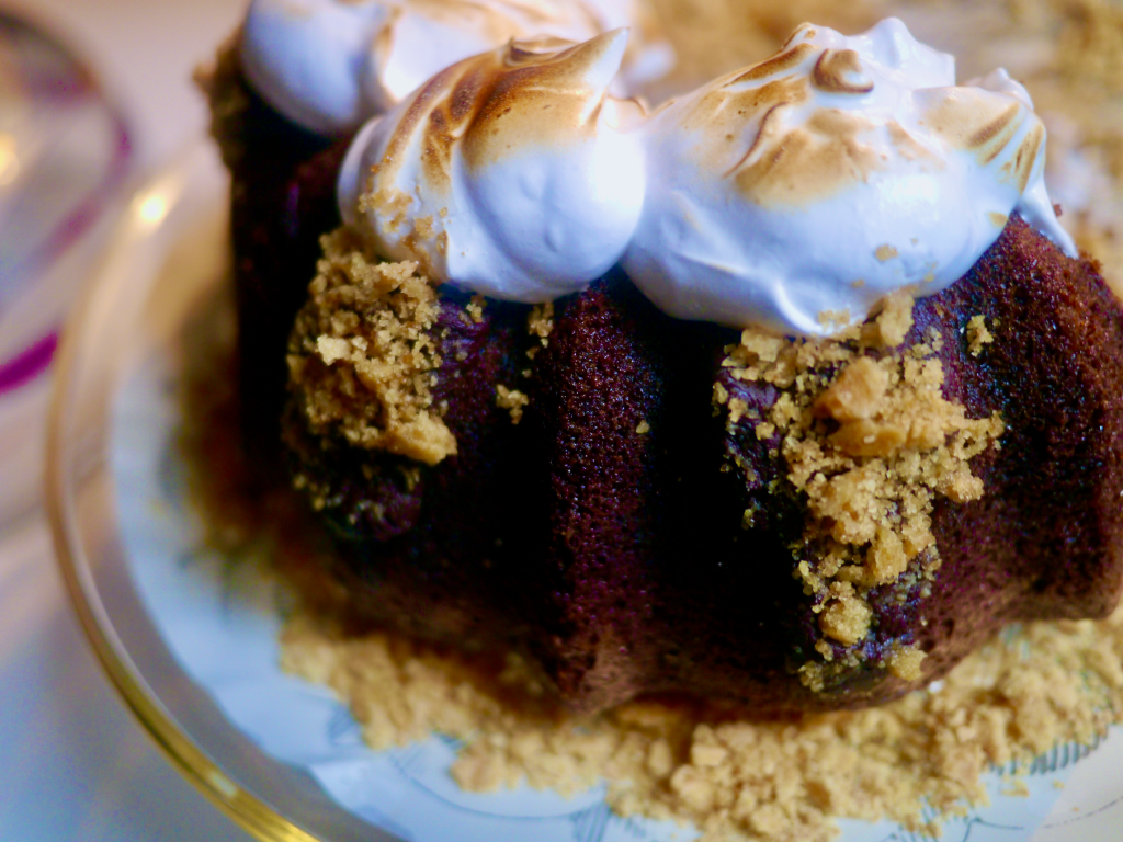 So, my guilty pleasure is marshmallow. And, really not the fancy homemade kind. Jet Puffed, cheap chocolate covered eggs or bunnys, hearts or santas. Peeps are okay but really just plain out of the bag marshmallows really make me smile. My Mom shipped them to me when I lived in Hong Kong. So, yes I love Rocky Road Ice Cream and of course S’mores. Imagine my delight when this cake appeared on Overtime Cook. While I by no means pretend to be a baker I thoroughly enjoyed baking the S’mores Bundt Cake. Instead of the Marshmallow Glaze using store bought fluff I made Marshmallow Fluff which is actually Swiss Meringue…and of course torched it for the full effect. FABULOUS doesn’t even begin to describe it.