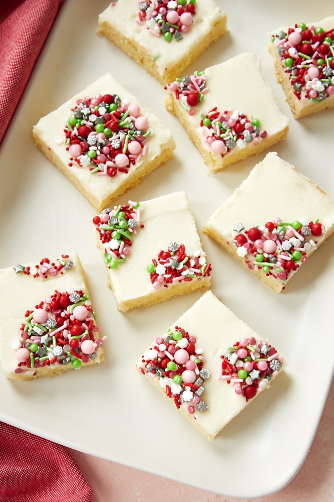 These Peppermint Sugar Cookie Bars are showstoppers. They come to us from my oh so talented cousin who pens the highly popular blog Bake or Break. Of course, how you decorate them is up to you. I feel like she outdid herself on temptation and aesthetic. It’s a sugar cookie in bar form, with peppermint, frosting and fancy, festive sprinkles. You simply cannot get more FABULOUS than these tasty treats. This time of year you’ll probably find fancy, festive sprinkles at your local retailer. If not, a quick Google will give you more options than one can imagine.