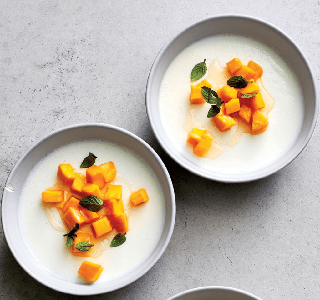 I made Buttermilk Panna Cotta this past summer as a first course with compressed watermelon instead of mango. While it is served chilled think about it being a wonderful holiday dinner starter with sweet corn and pancetta…citrus and roasted beets…or smoked salmon and caviar…add a dot or two of pomegranate aril…FABULOUS!!!