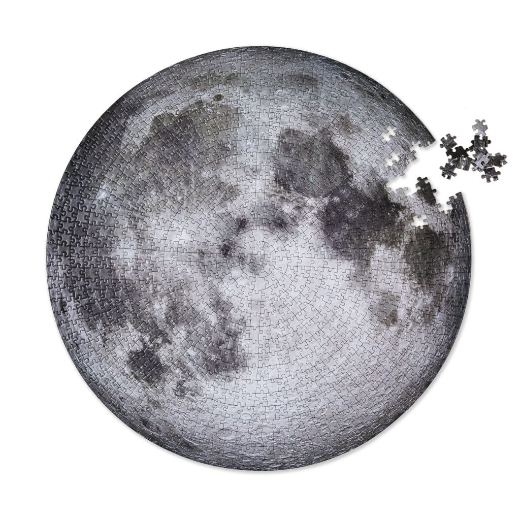 “Celebrating the July 16, 2019 50th anniversary of Neil Armstrong and Buzz Aldrin’s historic Apollo 11 Moon landing the puzzle features the near side of the Moon in startling detail. The NASA-provided photograph is the clearest image of the Moon to date displaying even the tiniest of craters in stunning clarity. The puzzle measures 26.5” diameter.”
