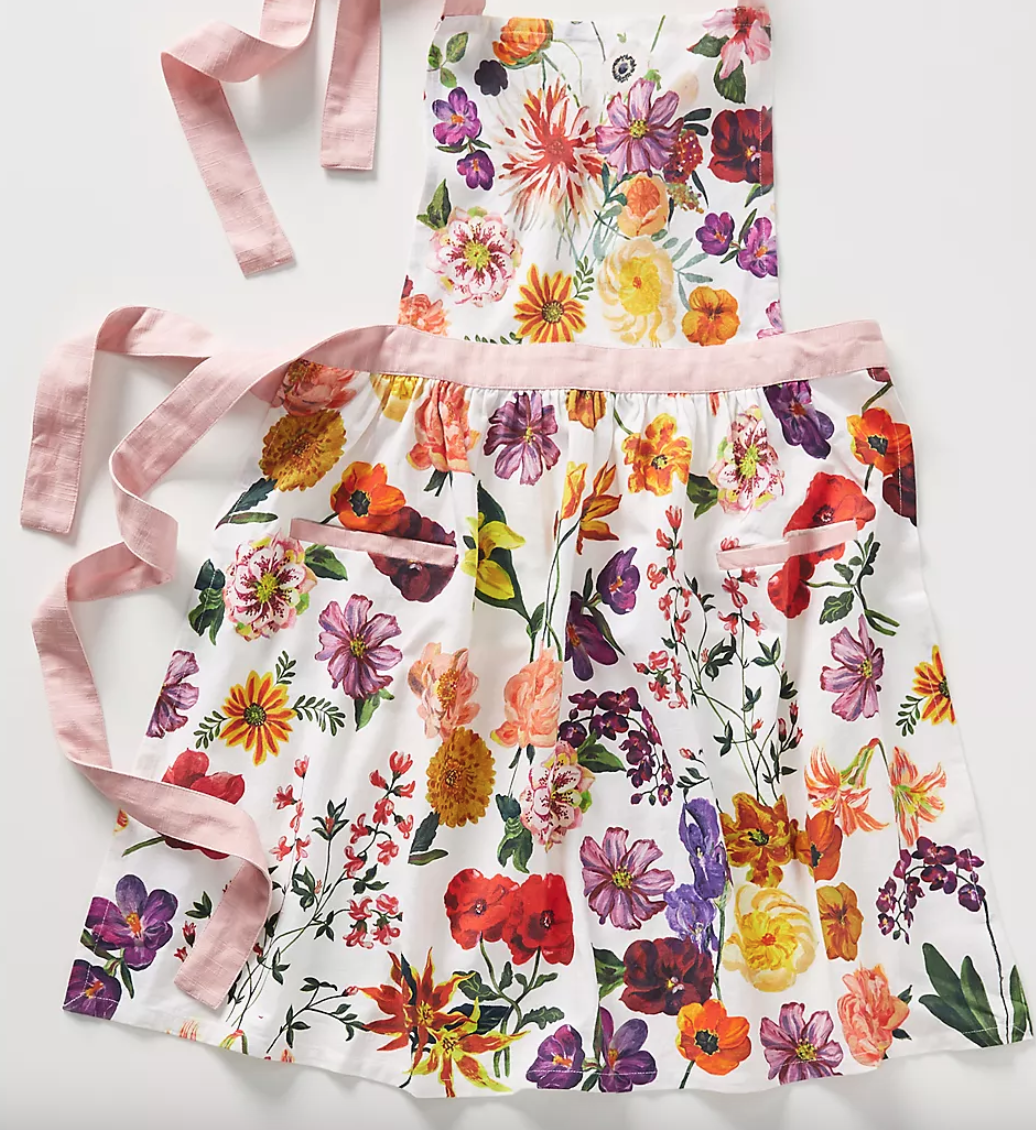 Featuring a blooming field of flowers, this apron was designed by Nathalie Lete for Anthropologie. Nathalie a French artist and designer creates paintings, ceramics, textiles, jewelry, books and toys centered on themes of fantasy, humor and childhood memories.