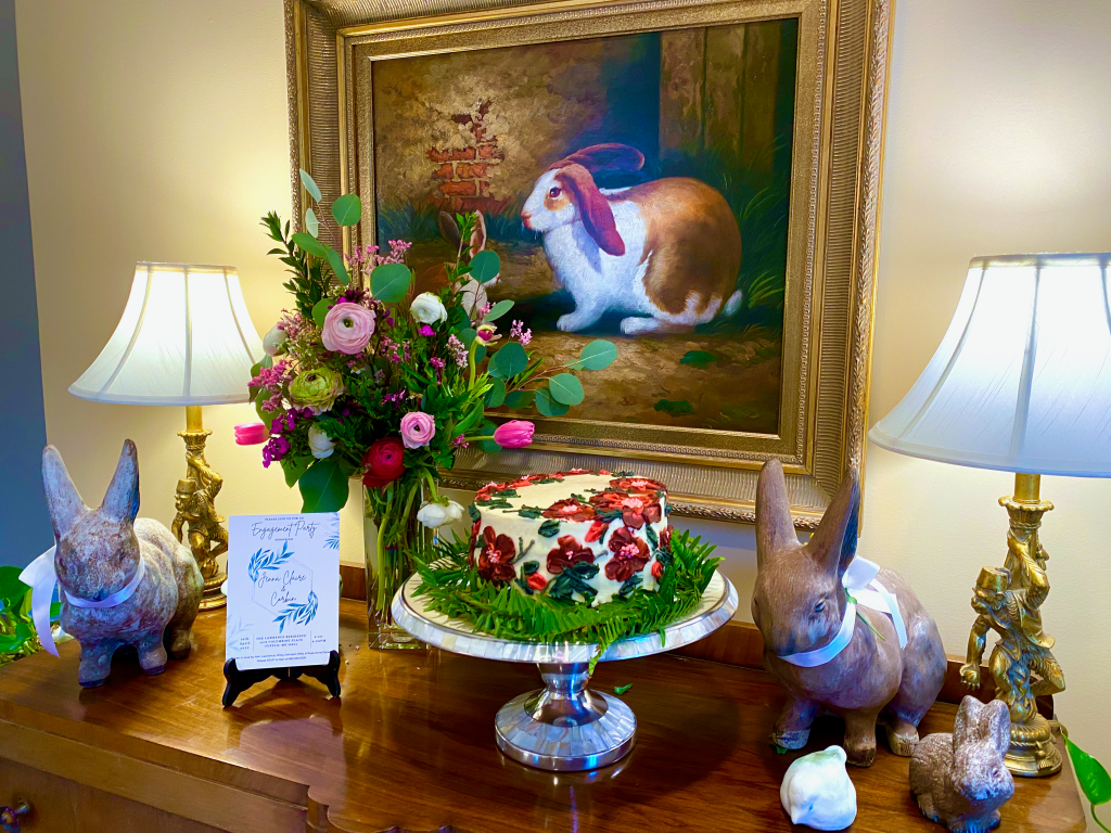 It’s such a joy to live to the age where one gets to see an extremely talented musician friends’ child grow into an equally talented Baker. I have such wonderful memories of studying music with Judy Key Irvin at Northeast Junior College. Now, Judy’s gifted daughter, Ashley helps us create memories by designing a lovely Spring cake…strawberry with dark chocolate filling and a buttercream frosting scattered with hand painted roses in the Bride-to-be’s colors. The combination of flavors, soft yet sturdy sponge with the perfect crumb and velvety buttercream made for a delectable masterpiece. Again, McCarty bunnies take their rightful place as the entry focal point grazing beneath the fresh floral designs created by sister and brother duo Rose Green Parker and Tommy Green.