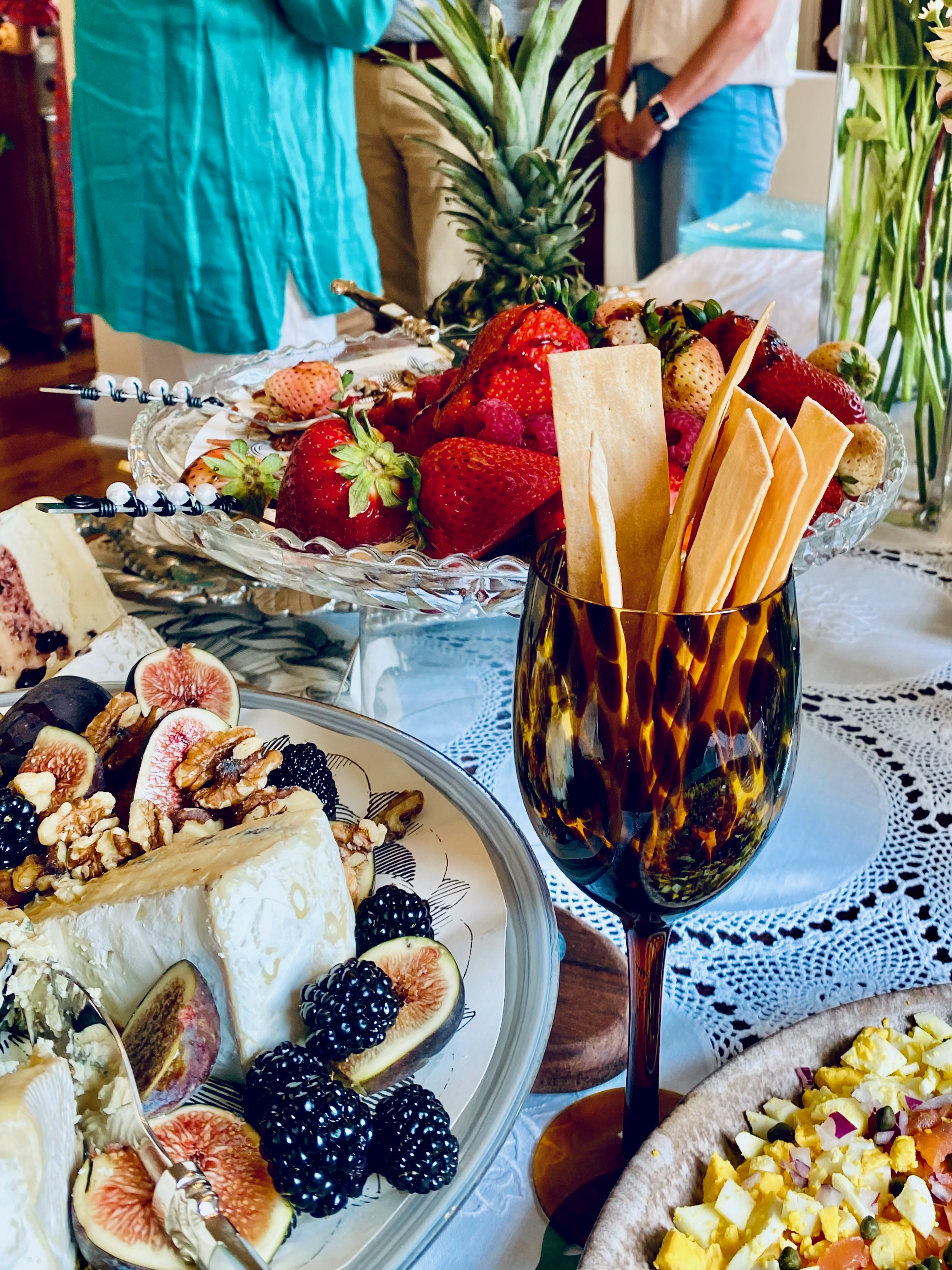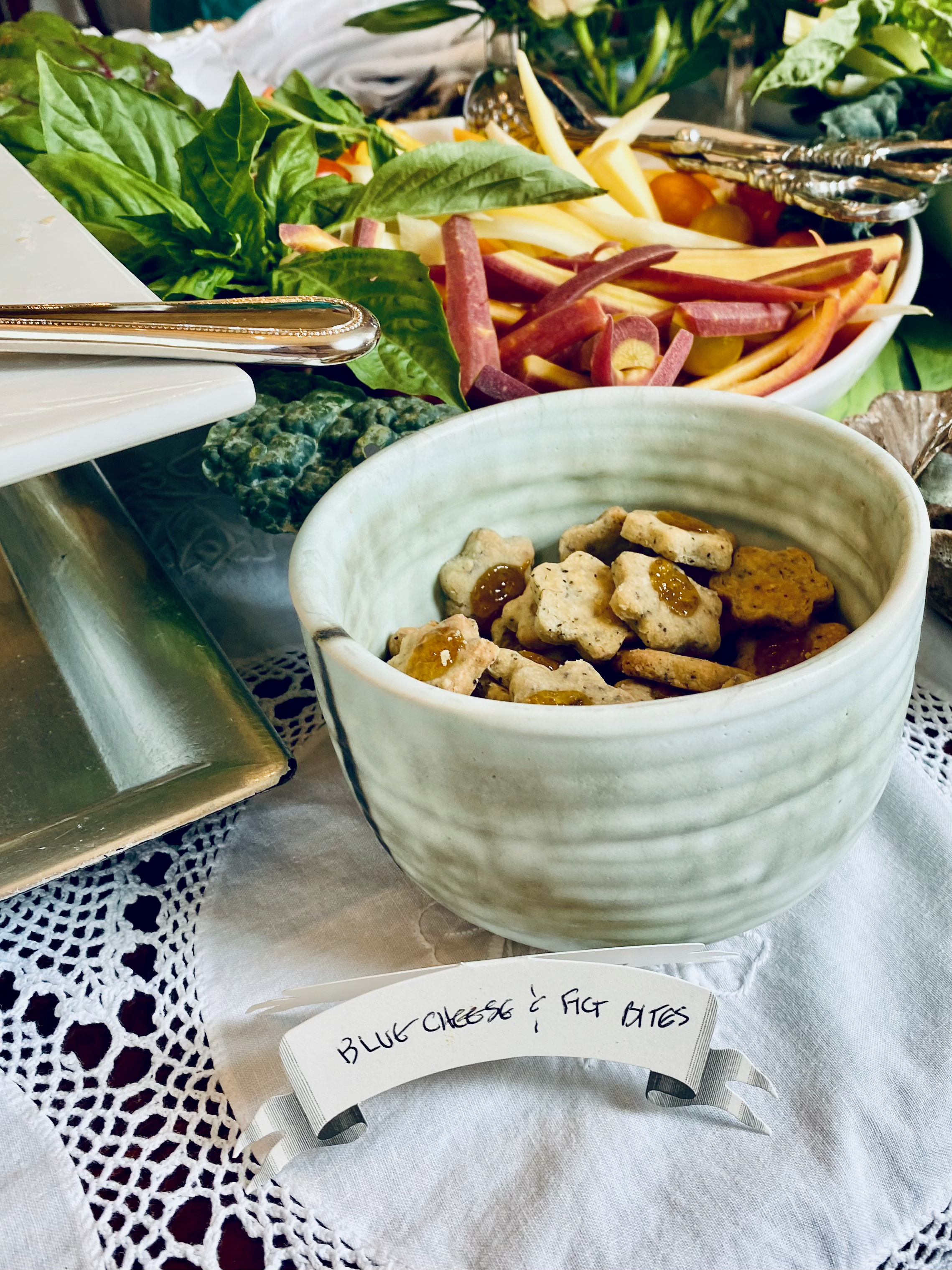 Flat breads stood proudly in yet another family heirloom. This time it was a tortoise wine glass which brought the exquisite taste of Aunt Wanda to the table. Nan and I could write a book just about the serving pieces and linens we used. All the details let your guests know you care about their Soiré experience.