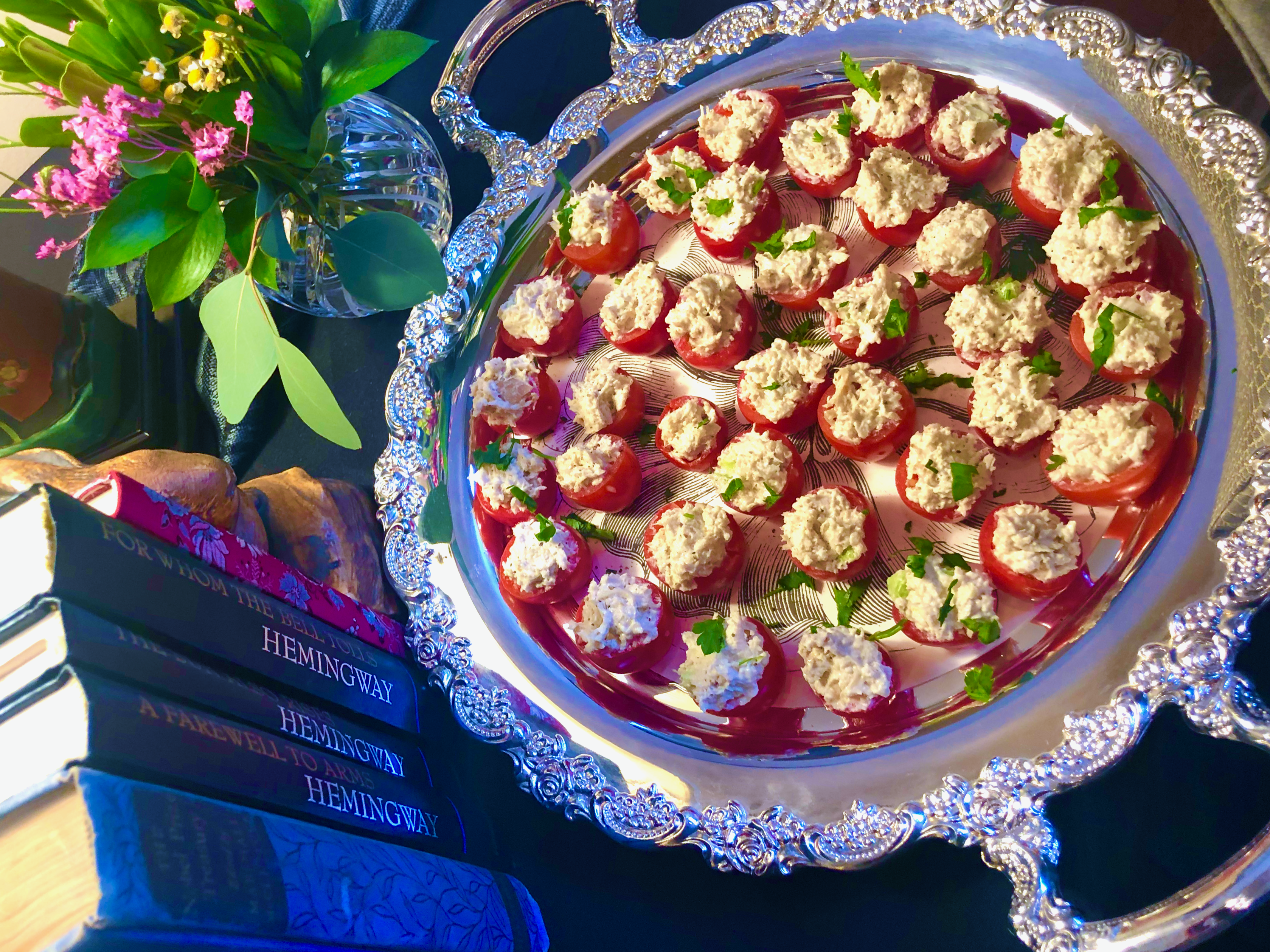 A hostess came to the kitchen and announced the guests wouldn’t find the stuffed tomatoes “behind that chair”. Hear me and hear me clearly…when a party is given in Mississippi and a silver tray of Campari Tomatoes stuffed with Roasted Chicken Salad is presented on a skirted table…people take on the traits of a bird dog. I wasn’t worried one bit about guests finding the Stuffed Tomatoes. I’ll admit there were few left but as Brandt boldly stated…”the party would’ve still been great with half the amount of food”. Sorry, Brandt. Mom’s philosophy will win every time…I will always “hope I have something you can eat”.