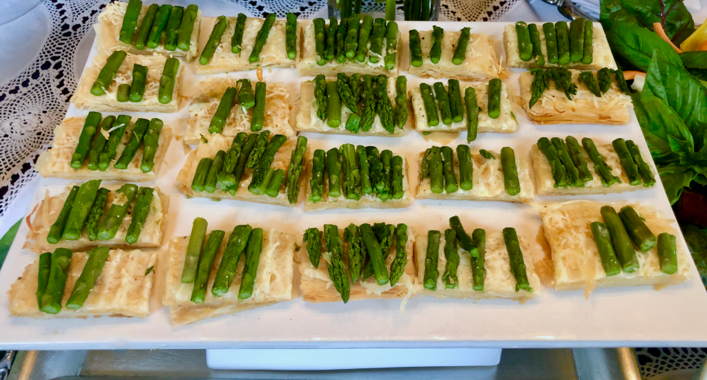 I will say the puff pastry creates a bit of a frame which holds the asparagus in place better. I bet I could’ve created a frame with the buttered phyllo but that will have to be a trick for next time. Nan informed me we’ll need to do two more of these events. 👀