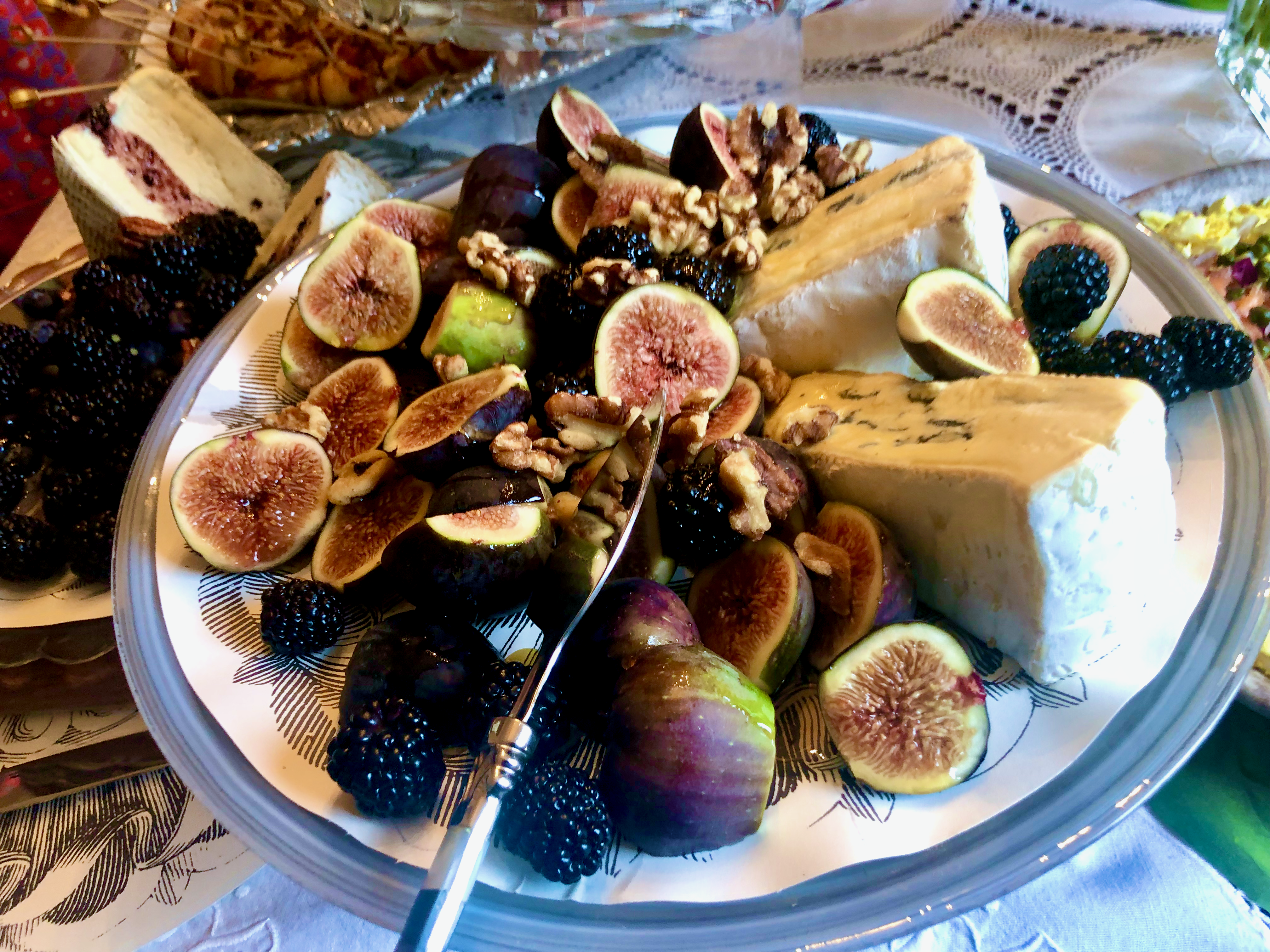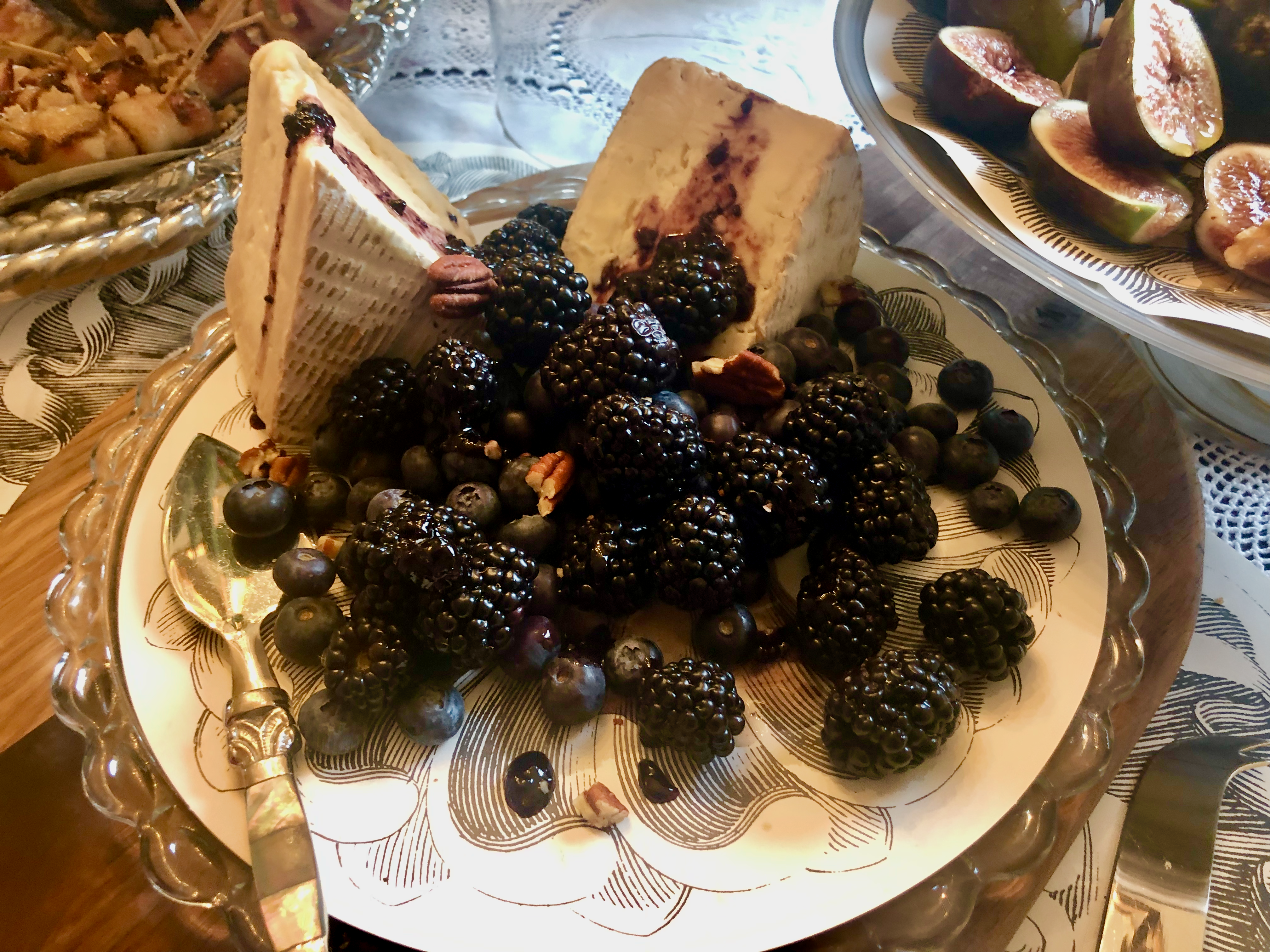 Saint Andre…Another triple cream cow’s milk, yet Saint Andre is not quite as ripe and held shape to create two pyramids on another piece of pressed glass…also passed down but we aren’t sure of its provenance. Huge, small seeded, very sweet blackberries and juicy blueberries accompanied the delicate, buttery yet bloomy texture as well as a gentle swath of Bonnie’s Bourbon Berry Jam.