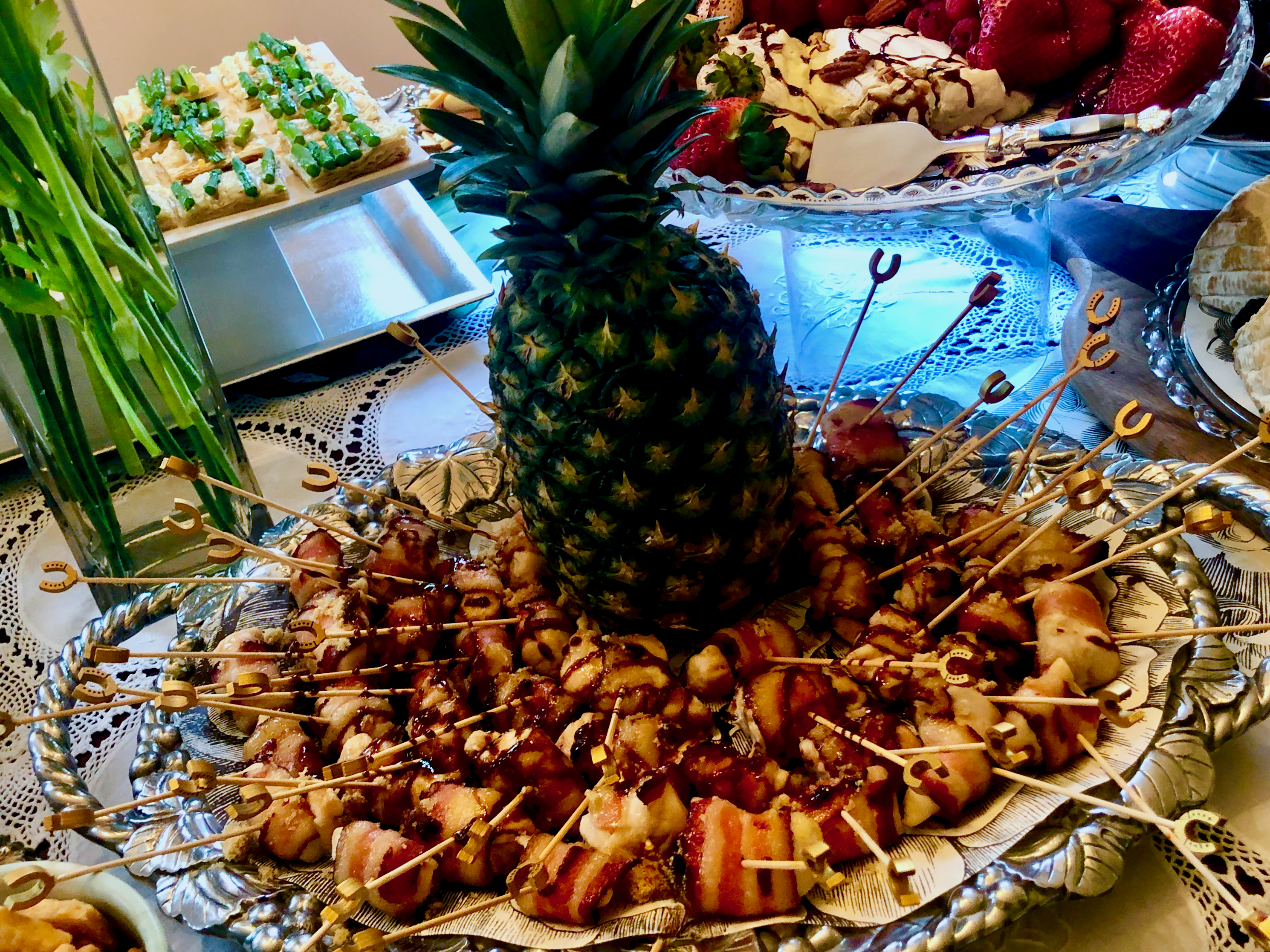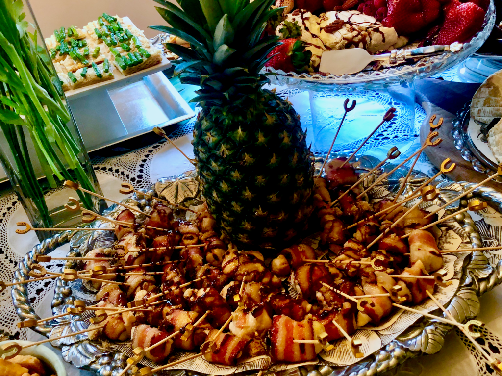 A number of years ago I attended an event and was totally blown away by something seemingly simple and as our dear friend Shirlee often said “a taste like…more”. Chicken wrapped in bacon is a no brainer. Yet, when it’s dredged in brown sugar and drizzled with sriracha and broiled for 25 minutes…stand back. The caterer at the party I attended had much more patience than I. Her’s were bite-sized…just a little larger than popcorn and I ate it like popcorn. I chose a two bite size and it was still a labor of love getting fatty applewood smoked bacon wrapped around a piece of slippery chicken. Did I mention I did this because I love my cousin. Then, for a bit of whimsy I found skewers with gold horseshoes on them in hopes of bringing the couple prosperity and all the good luck in the world. A fresh pineapple anchors the tray as the universal symbol of hospitality and the logo of Bon Appétit Catering.
