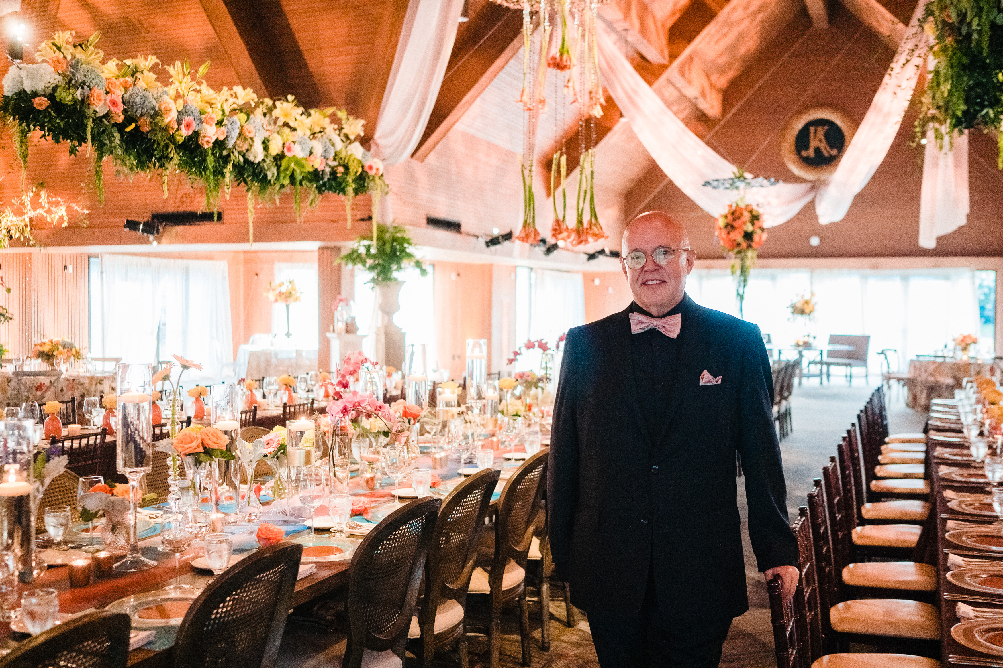 Cocktail hour allowed for the arrival of the wedding party. Thank goodness I had watched Downton Abbey as I was asked to be Mr. Bates to the groom. Nash really wanted his wedding attire to include his White Dinner Jacket which was custom designed by his late father, a well known Lexington tailor. Julie was a bit disappointed. I understood her feelings but after we found THE gown I assured her that a white dinner jacket wouldn’t upstage her. Of course, Nash came up with the perfect solution to wear the dinner jacket…at dinner. He asked me to meet them upon their Keeneland arrival for his quick change.