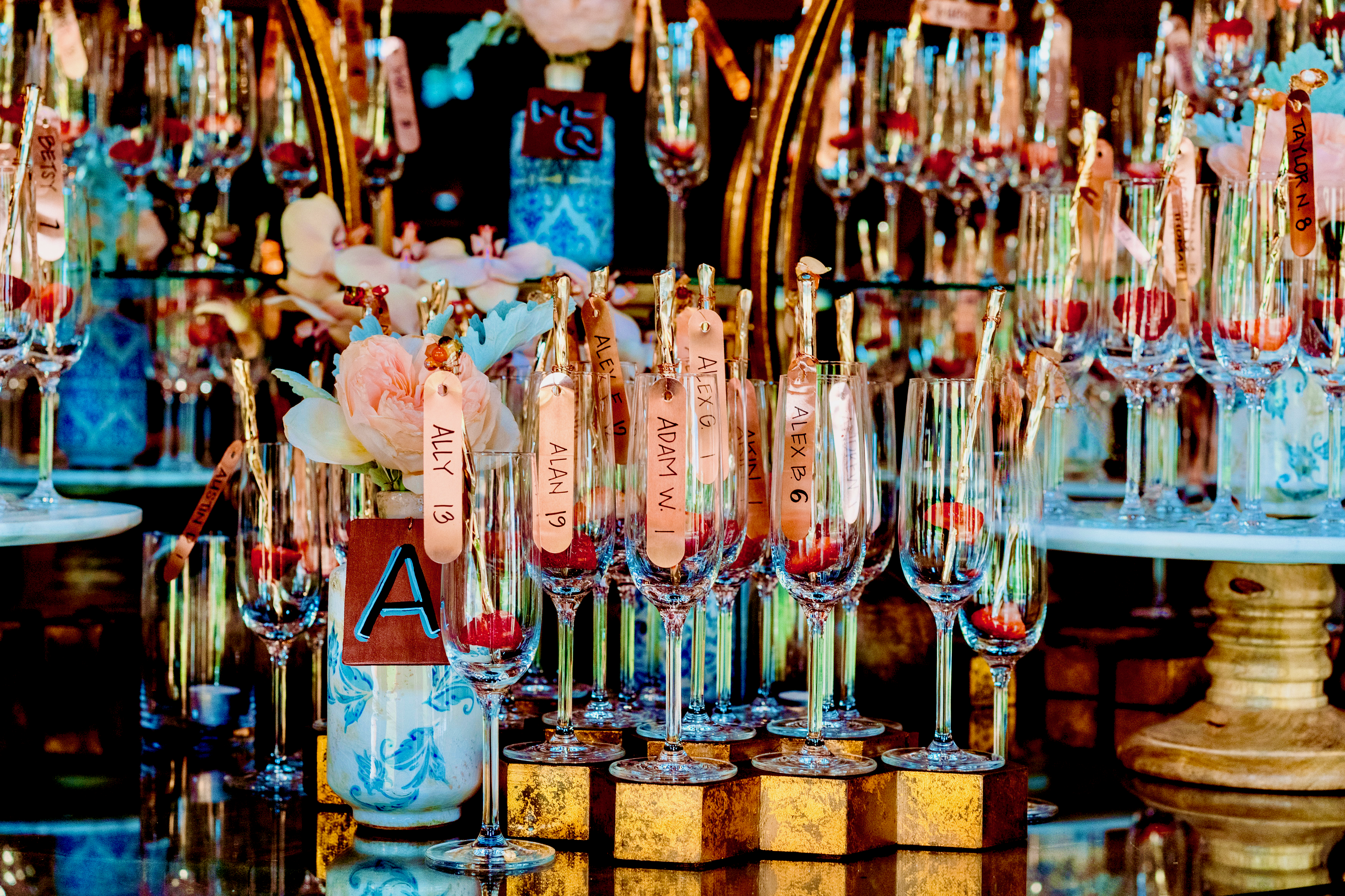 We used a variety of Bourbon bottles for table numbers. Then menus also served as place cards and were printed on Copper Sparkle Paper. The wedding party and parent’s had 2021 pennies to embellish their menu. FYI Abraham Lincoln was born in Larue County and Sarah Todd Lincoln’s home is a historical site in Lexington. As I mentioned Julie had always wanted pops of blue and green with the Bourbon color palette. I called on one of my competitive marching band contacts. Field and Floor FX printed table runners and placemats with a fully saturated range of Julie’s wishes. This was a TimMagic surprise which totally stunned the Bride.