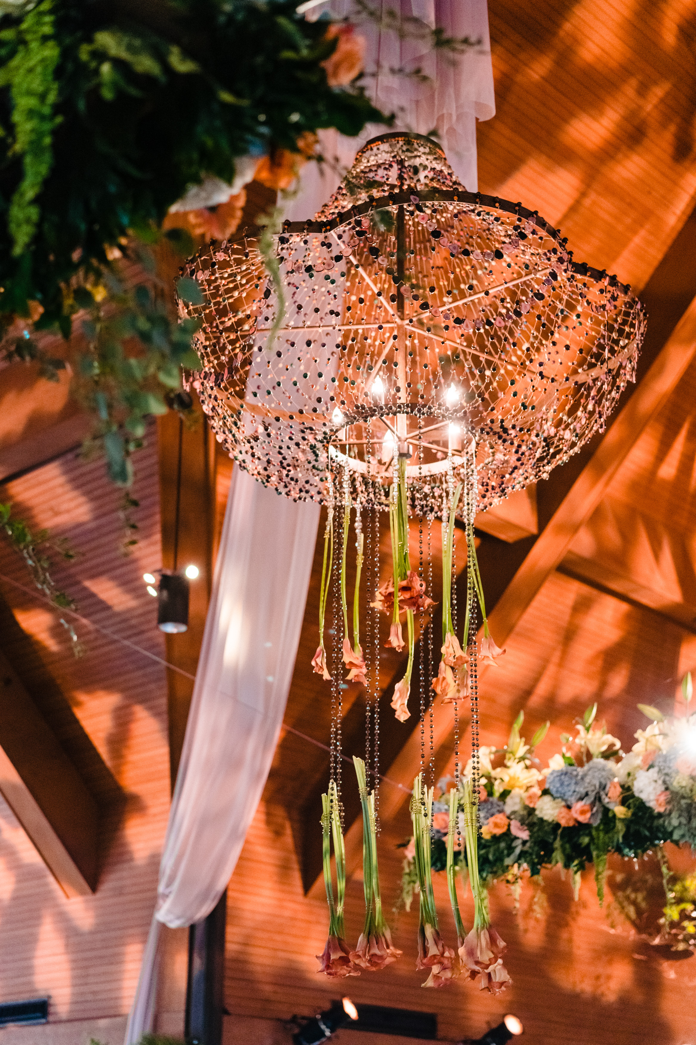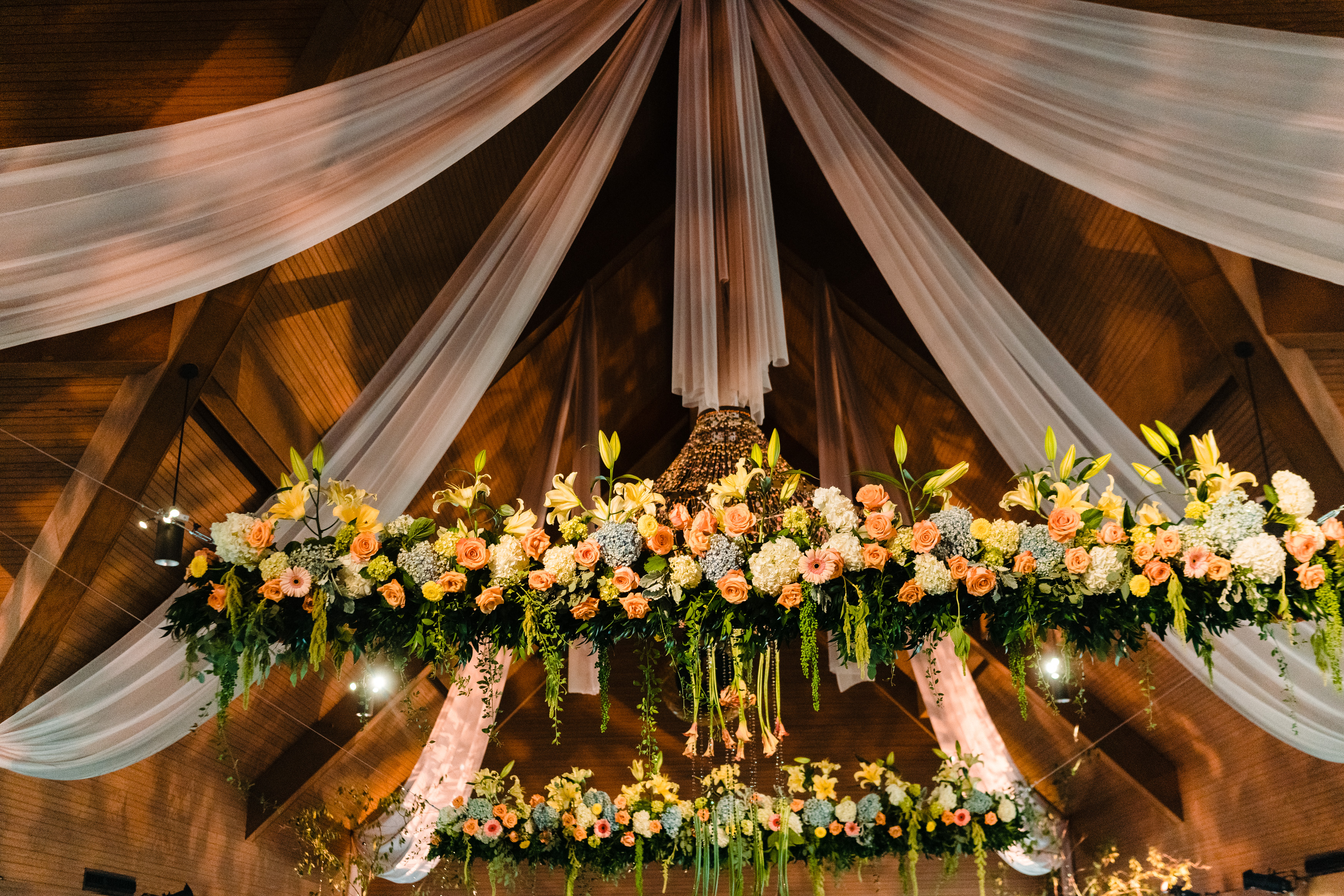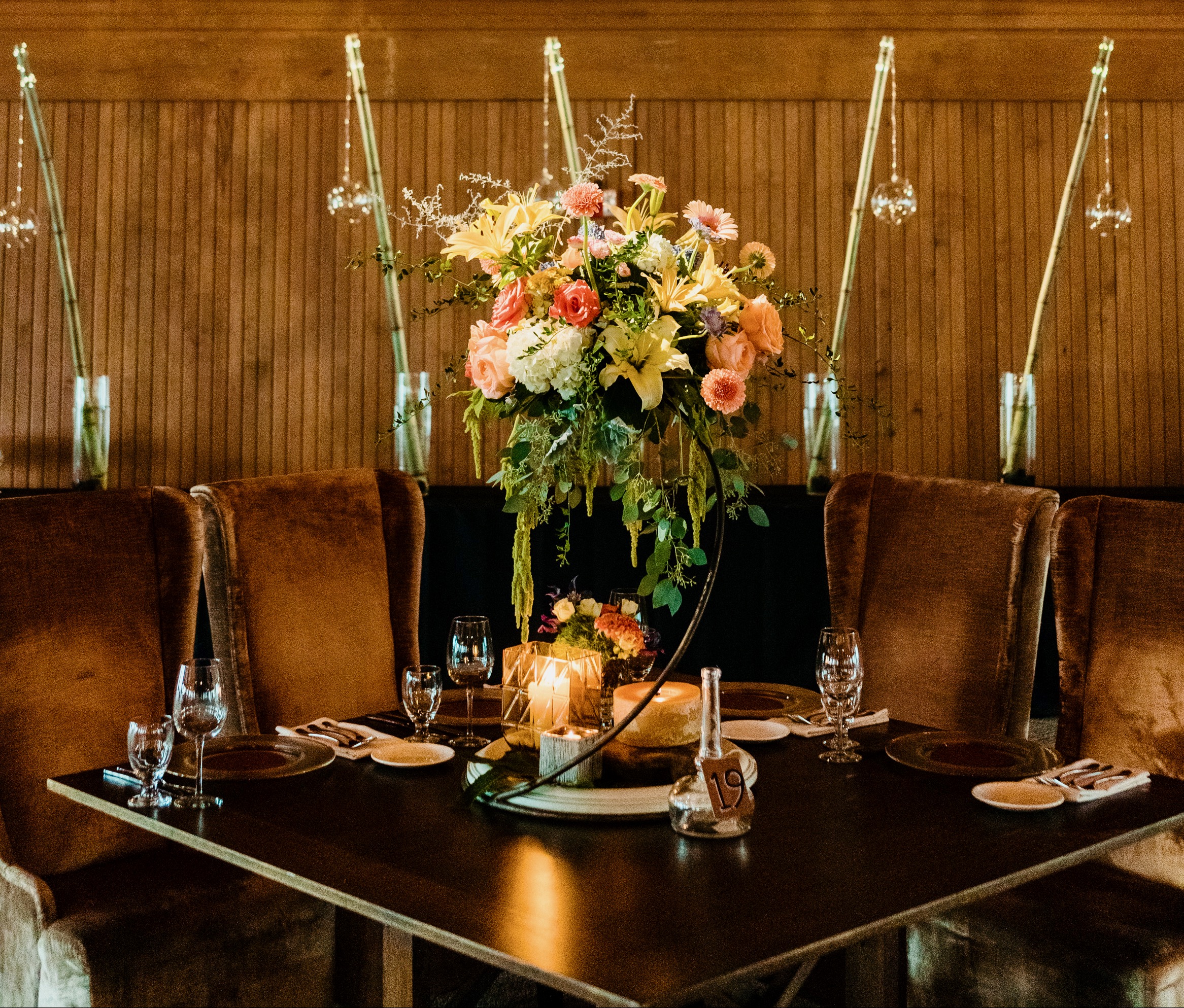 Like the Barn, the Entertainment Center is huge…it seats 450. Covid had narrowed our guests list more than we ever expected. Nevertheless, I had already created a floor plan to ensure the space didn’t feel cavernous. Kim Fitzpatrick and her Fitz the Occassion crew did an outstanding job of draping the ceiling and windows to soften the wood surfaces. Randy Scheid with Vincent Lighting created a magical ambience. Rosemary, Hunter and the Jody’s team went over and beyond our dreams. Julie sent me numerous photos of weddings with outdoor, daytime, garden-type aesthetics. We had lots of conversations about what I could and couldn’t do at a 7pm, Black-tie event. Nevertheless, we did everything we could to create the feel of a garden inside the Entertainment Center. Many of the guests commented they had never seen anything to compare.